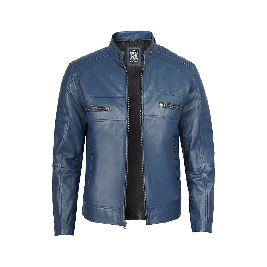Crafted from 100% genuine lambskin leather, this striking blue cafe racer jacket redefines motorcycle-inspired style with its vibrant hue and premium construction. The sleek silhouette and meticulous detailing create a head-turning piece built to last.
