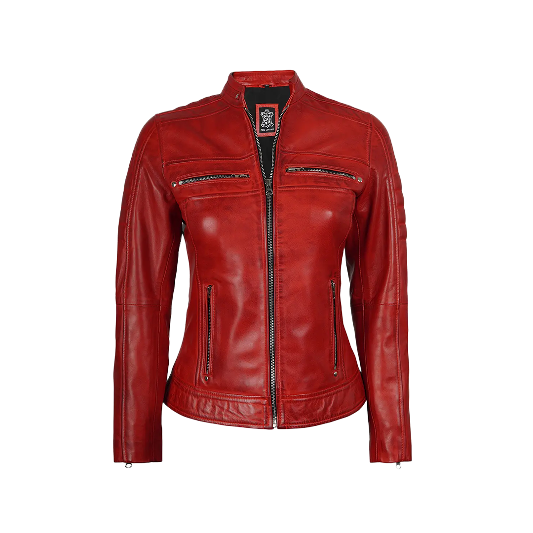 Turn heads and own every moment with the Austin Red Cafe Racer Jacket — a sleek, high-energy essential designed for women who want their style to make an impact.