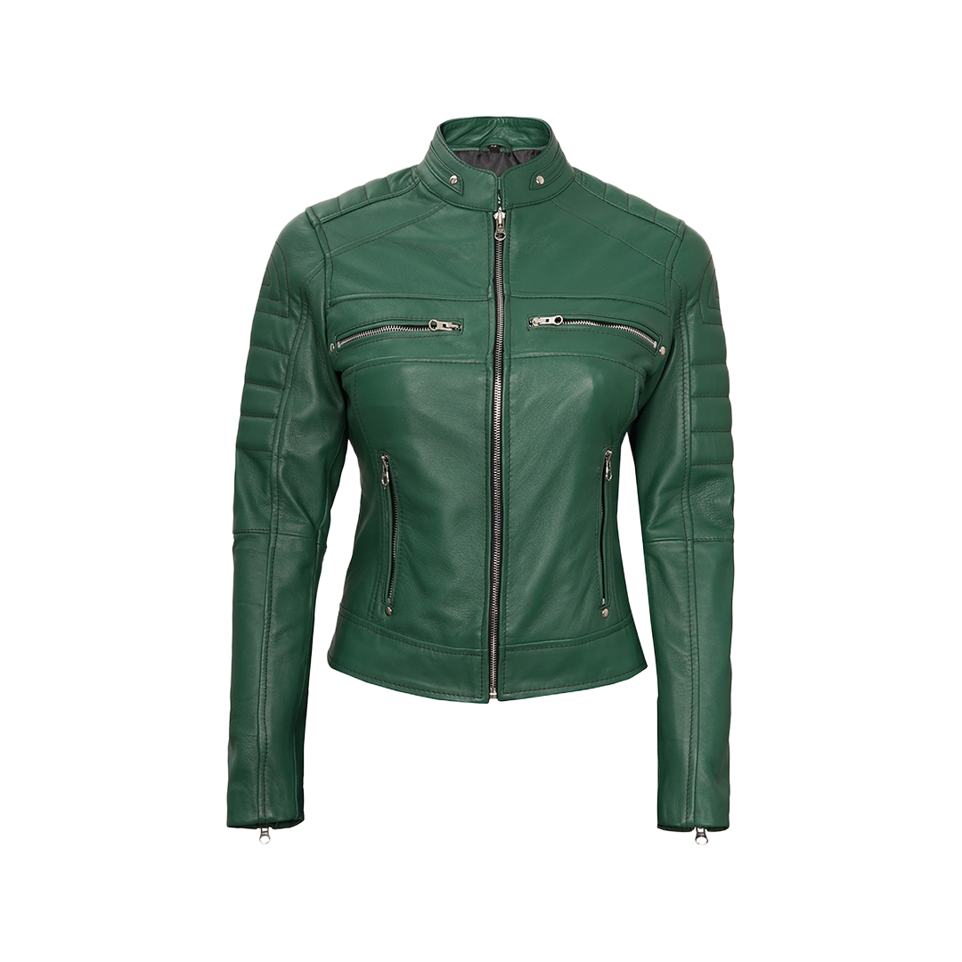 Make a bold impression with the Austin Women's Green Cafe Racer Leather Jacket — a modern twist on a classic silhouette. Crafted from premium lambskin leather, this jacket blends sleek design with rich color to create a standout piece that’s as versatile as it is eye-catching.