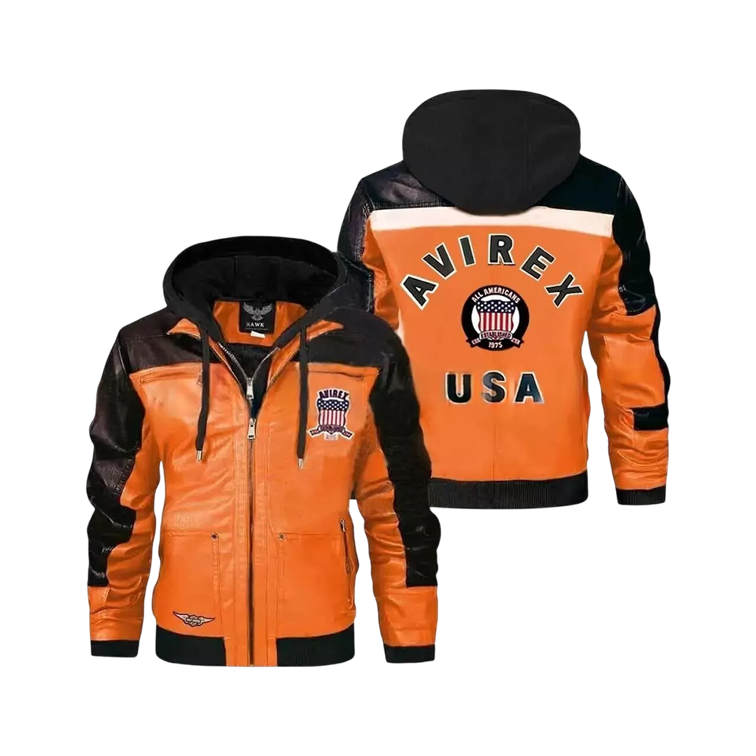 Command attention on and off the road with the Avirex “Millionaire” motorcycle jacket — a striking black and orange combo with removable hoodie and bold biker attitude.