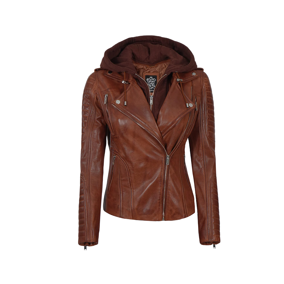 Add instant edge and elegance to your wardrobe with the Bagheria Cognac Biker Jacket—where premium leather meets practical design. Hood on or off, it’s your go-to for standout, all-season style.