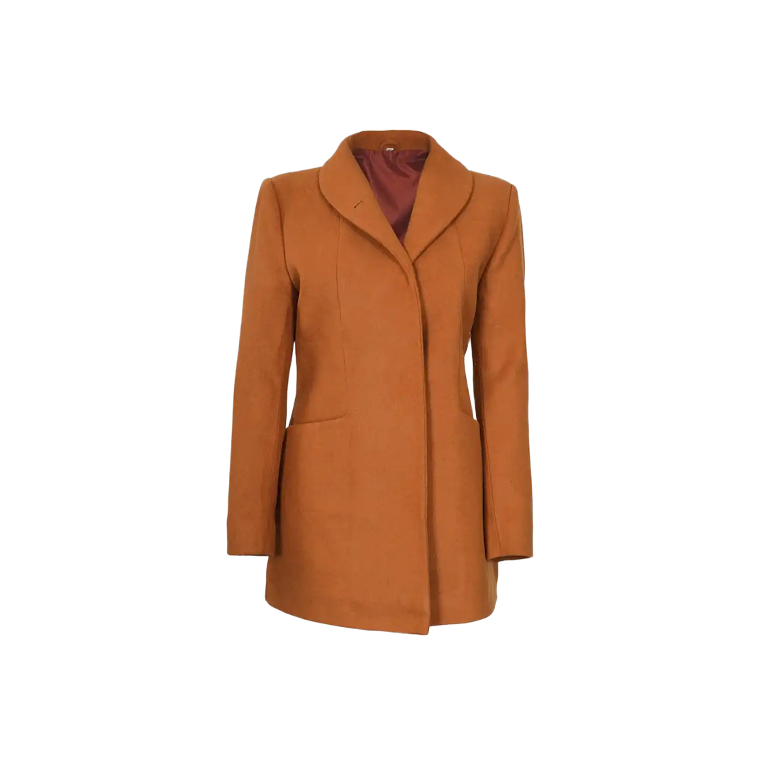 The rust hue, combined with its clean tailoring and soft lapel, offers a warm, understated sophistication that transitions seamlessly from day to night. Ideal for those who value elegance in the details.