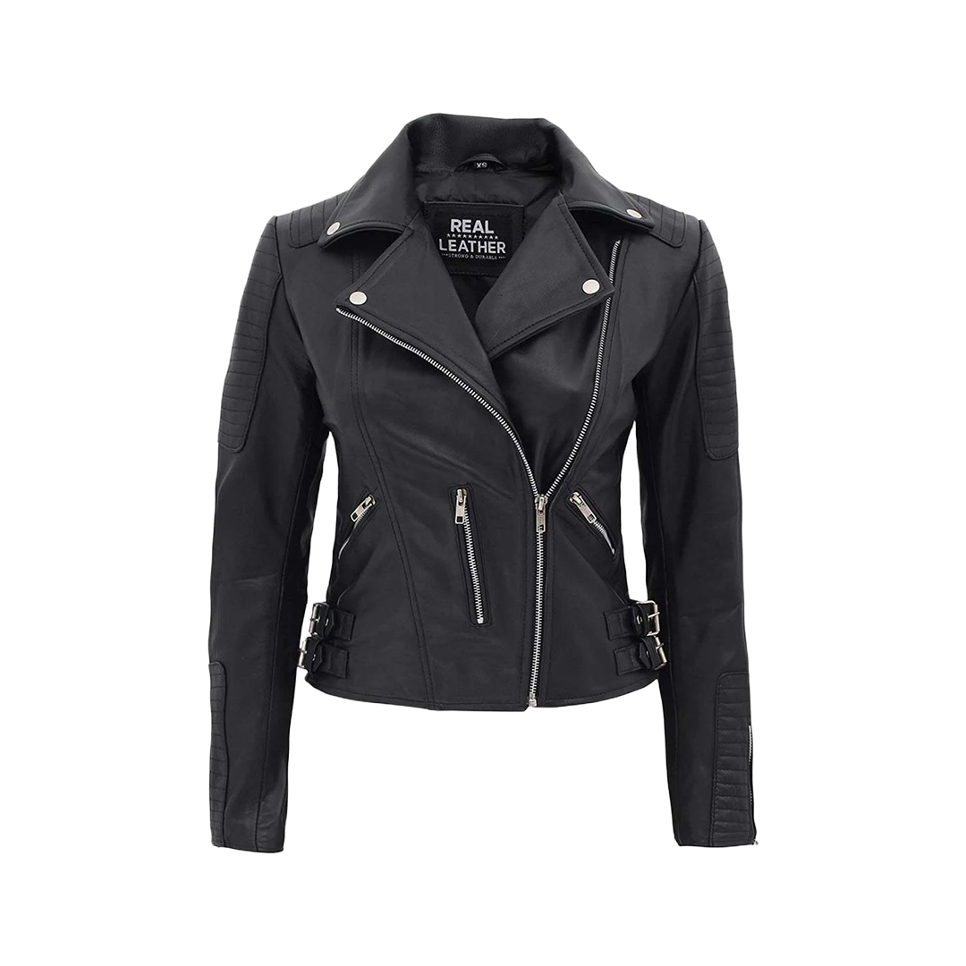 Expertly tailored from 100% real lambskin leather, this biker-style jacket offers a supple feel with long-lasting durability. The asymmetrical zipper and waist belt adjuster deliver a flattering silhouette, while stitched panels on the shoulders and arms add bold character and texture.