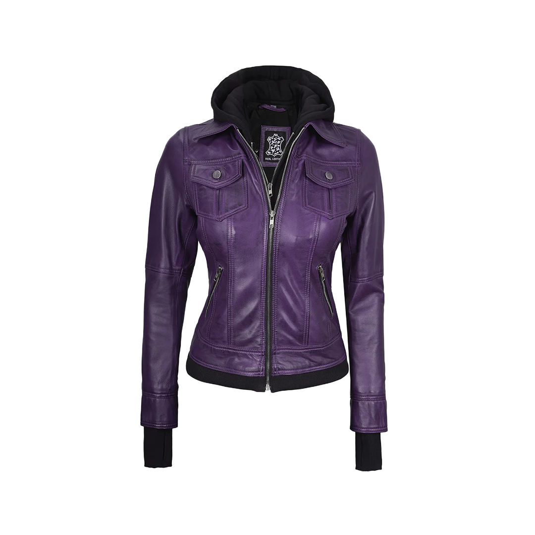 Stylish, flexible, and crafted to last—the Betty Women's Purple Leather Jacket with Removable Hood is your new go-to for all-season wear, offering a sleek silhouette with a punch of personality.