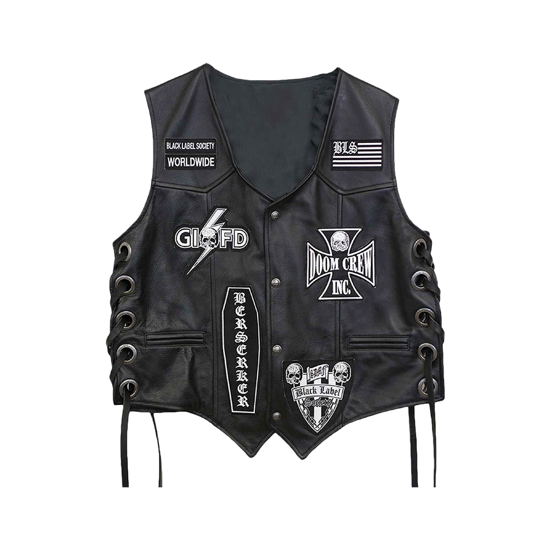 Ride in style with this Black Label Society biker vest, expertly crafted from high-quality full grain cowhide leather. Designed for motorcycle enthusiasts, this vest offers both durability and a bold statement look. The soft inner lining with microfiber insulation ensures warmth and comfort, making it ideal for long rides or everyday wear.