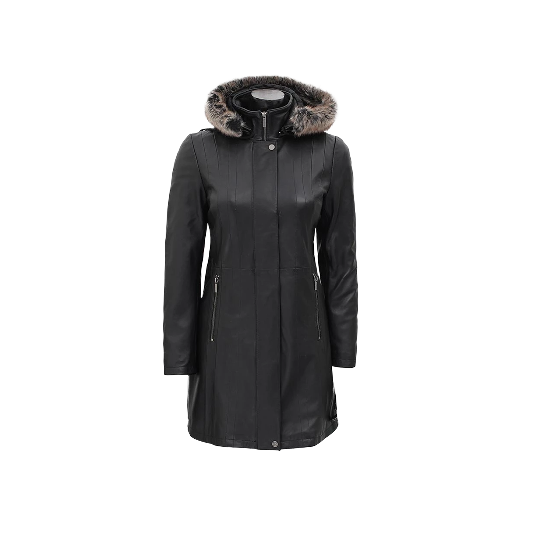 Expertly crafted from 100% real leather, this full-length coat is finished in a sleek black tone for an elevated, polished look. The inner lining is made of soft polyester, offering warmth and comfort without adding bulk. A removable faux shearling hood provides cozy versatility for changing weather.