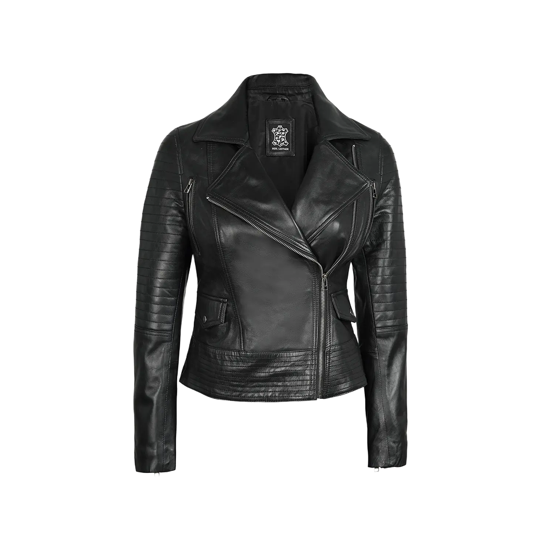 Command attention on the road or in the city with our Black Leather Moto Jacket for Women. Designed for those who embrace bold fashion, this jacket is crafted from 100% real lambskin leather, offering both rugged durability and a sleek, timeless silhouette.