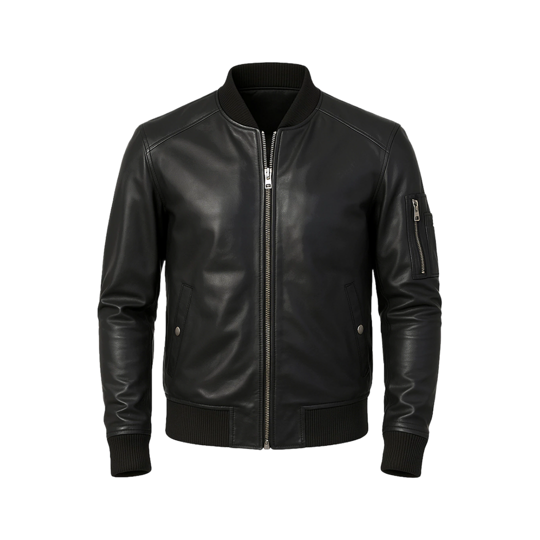 Command attention with this sleek black lambskin bomber, blending premium craftsmanship with urban functionality. The ribbed detailing and multiple utility pockets create a sharp, modern silhouette that stands out in any setting.