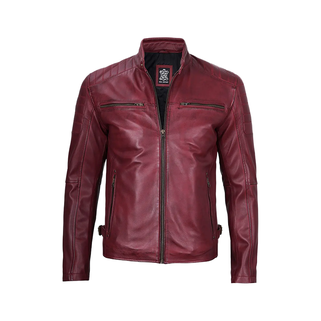 Elevate your wardrobe with this striking burgundy cafe racer jacket - where timeless style meets modern performance.