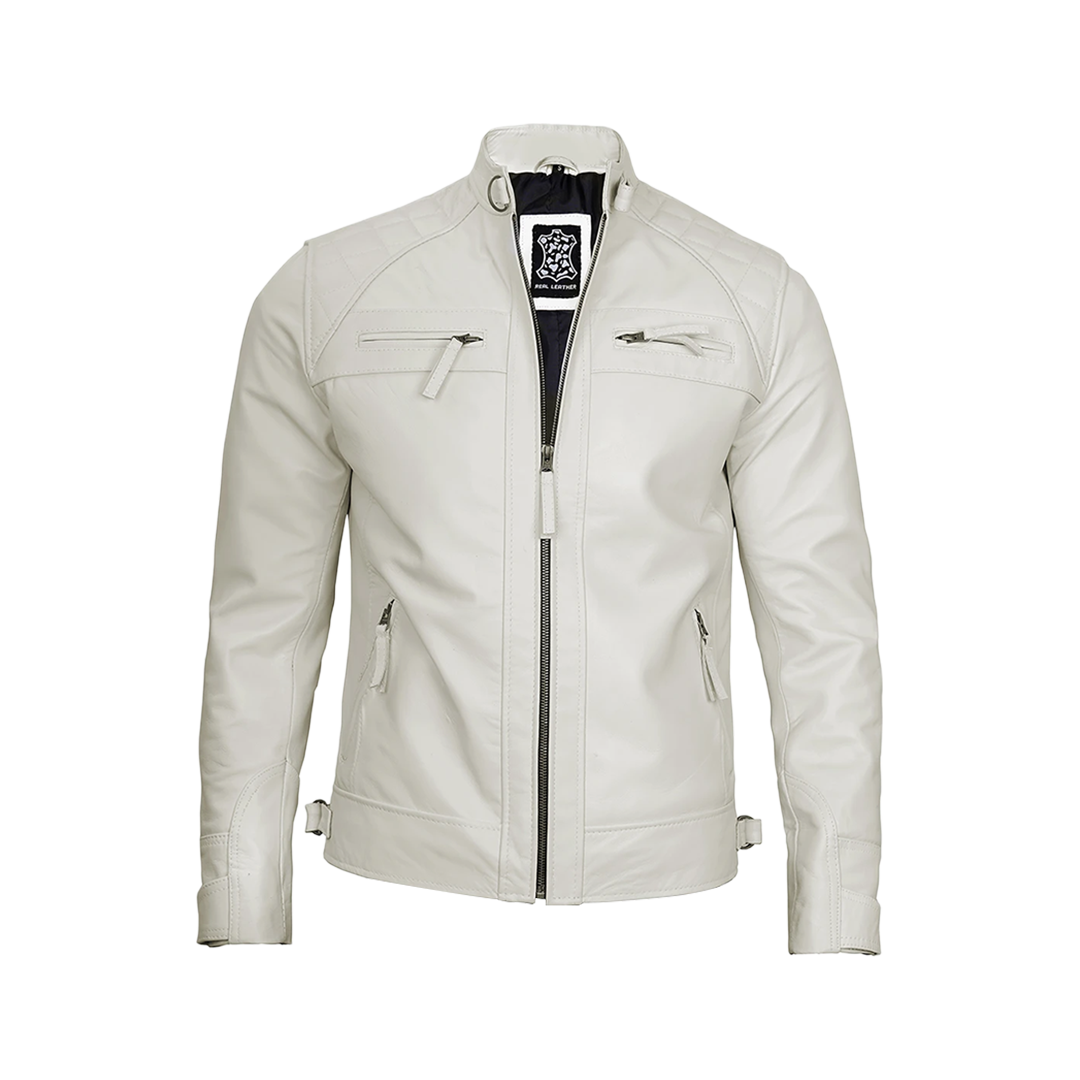 Crafted from 100% genuine lambskin leather, this off-white cafe racer jacket delivers a striking balance of vintage-inspired style and contemporary functionality. The diamond-quilted shoulder detailing and crisp color create a head-turning piece that elevates any wardrobe.