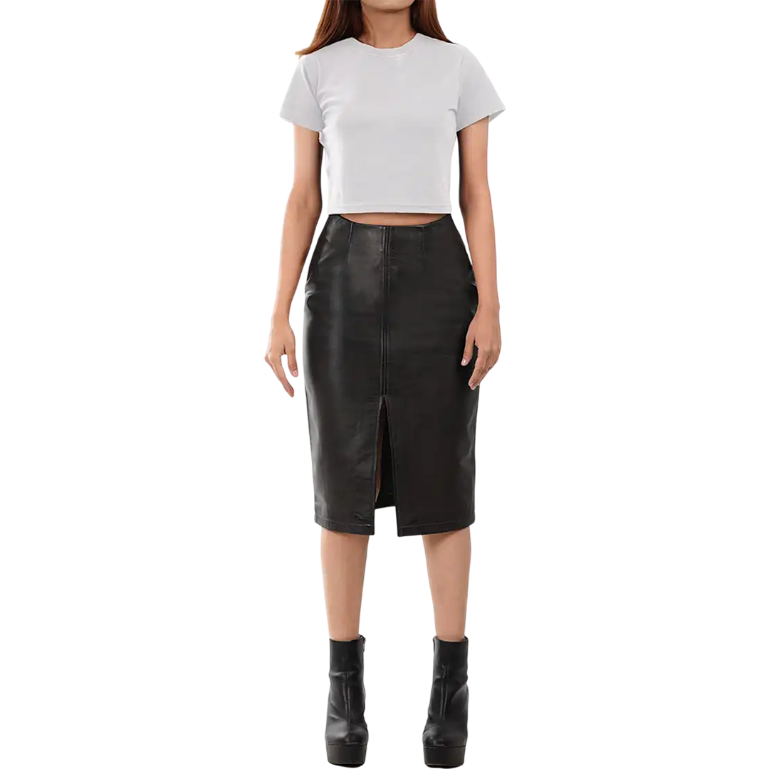Command attention with the Deena Black Leather Midi Skirt, crafted for women who value both structure and style. Its high-waisted pencil silhouette hugs your curves, while the front and back slits offer movement and a hint of allure.