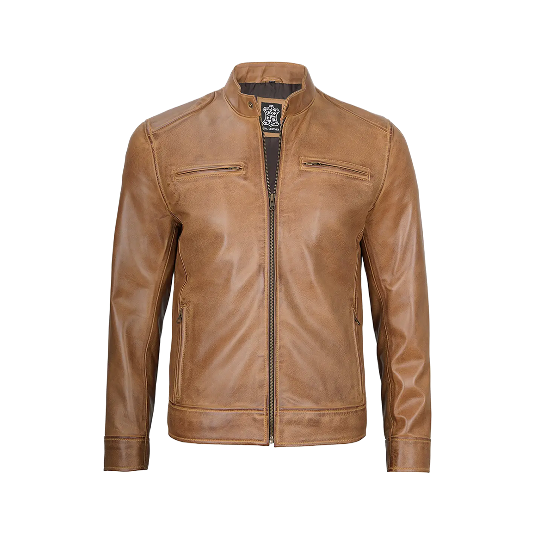 Crafted from 100% genuine lambskin leather, this camel-colored cafe racer jacket blends classic motorcycle heritage with everyday wearability. The rich hue and premium construction create a versatile piece that improves with age.