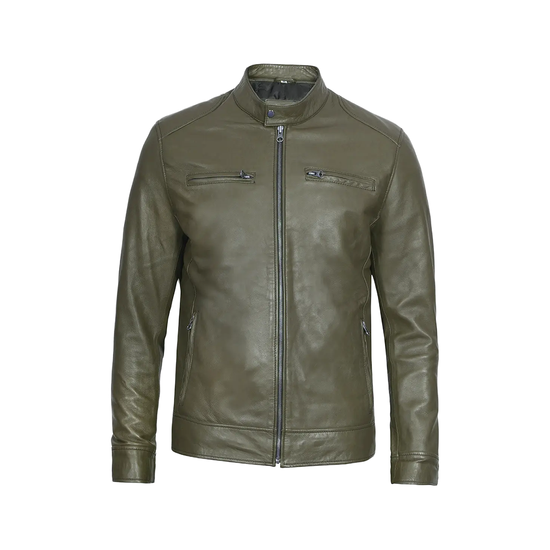 Make a bold statement with this distinctive green leather jacket. Expertly crafted from 100% genuine lambskin, this cafe racer combines timeless design with a modern color twist for head-turning style.