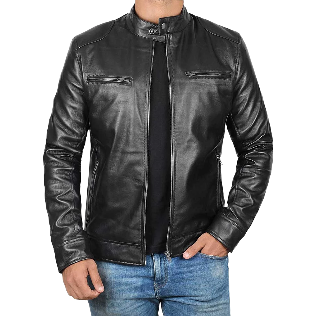 Experience timeless style with this black leather jacket designed for taller men (6'0" - 6'4"). Crafted from 100% genuine lambskin leather, this cafe racer combines classic motorcycle heritage with modern functionality.
