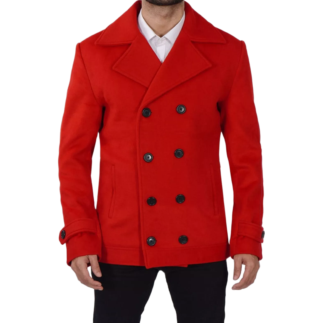 Celebrate the festive season in bold style with our Men's Red Wool Pea Coat, designed for both warmth and elegance. With its double-breasted front and sharp tailoring, this winter-ready outerwear brings timeless sophistication to any wardrobe – whether you’re headed to a formal dinner or a weekend gathering.