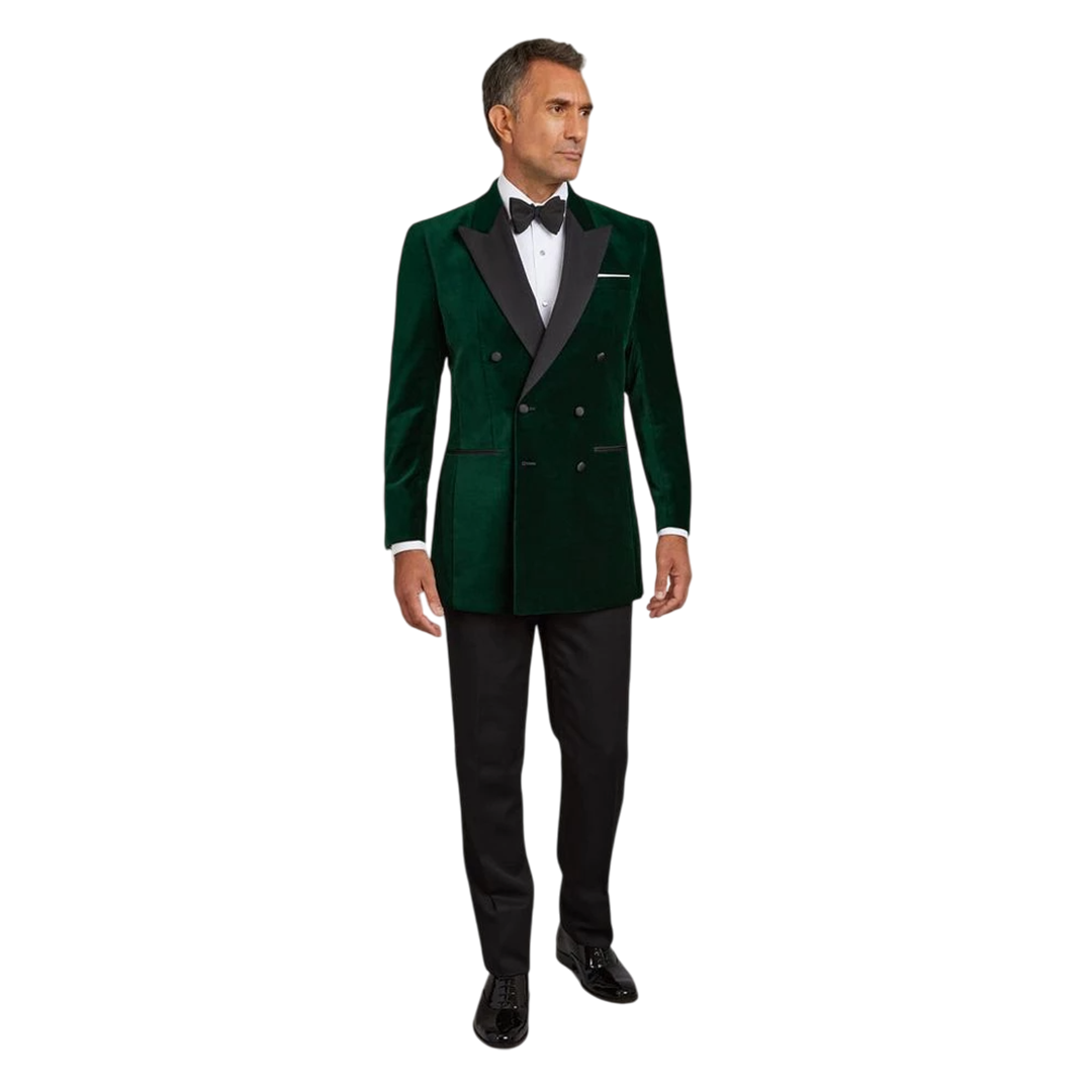 Command every black-tie affair in this arresting double-breasted tuxedo, where the richness of emerald velvet meets the sharpness of satin peak lapels. Designed for the modern gentleman who values both tradition and individuality, this ensemble makes an unforgettable statement at weddings, galas, and exclusive soirées.