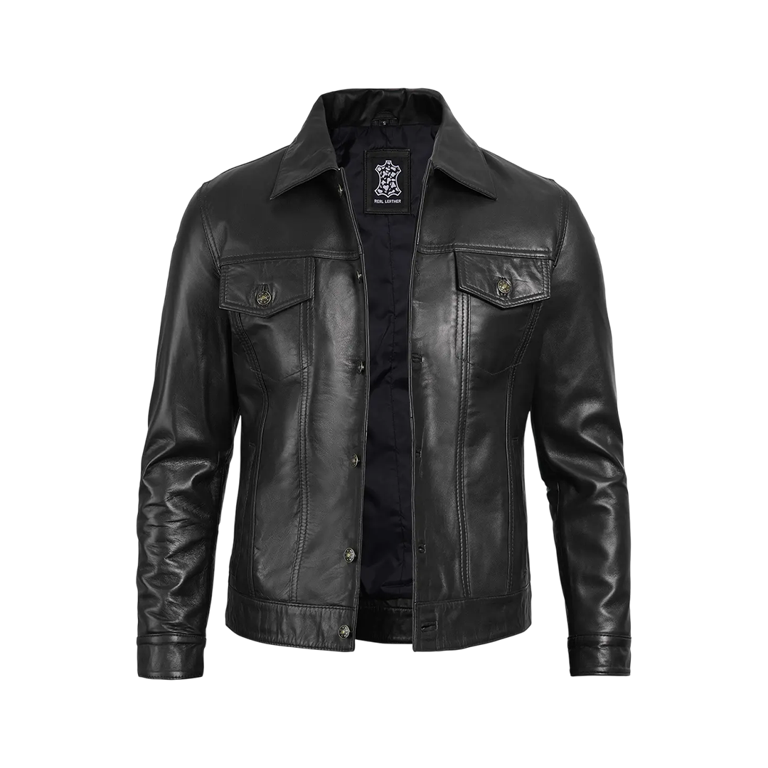 Elevate your everyday look with this timeless black trucker jacket, expertly crafted from 100% genuine lambskin leather. Designed with double-stitched seams and functional pockets, it delivers rugged durability with a refined silhouette—perfect for layering or wearing solo.