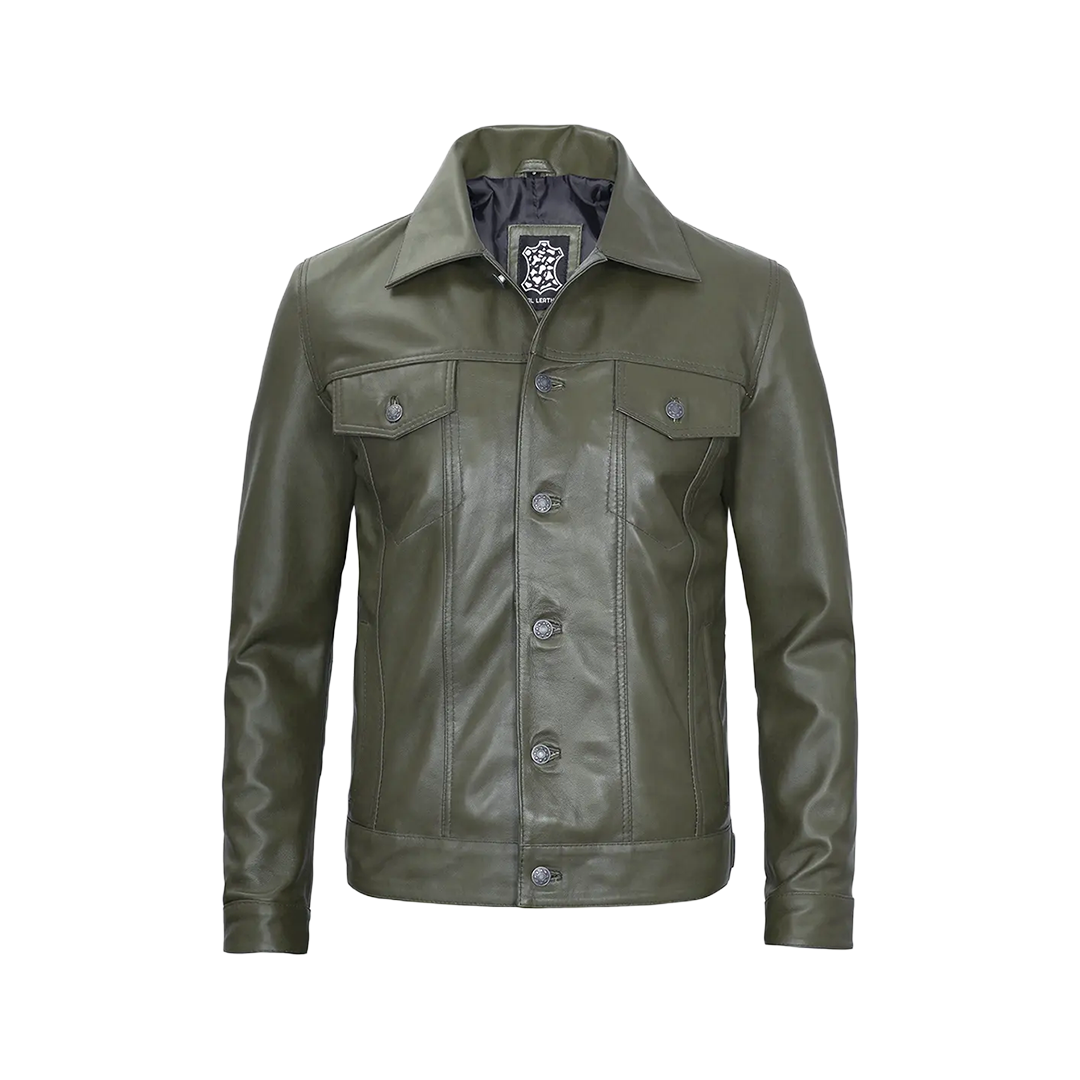 Crafted from 100% genuine lambskin leather, this dark green trucker jacket offers a fresh alternative to traditional neutrals. The Harrington-inspired collar and premium detailing create a distinctive look that stands out while maintaining everyday wearability.
