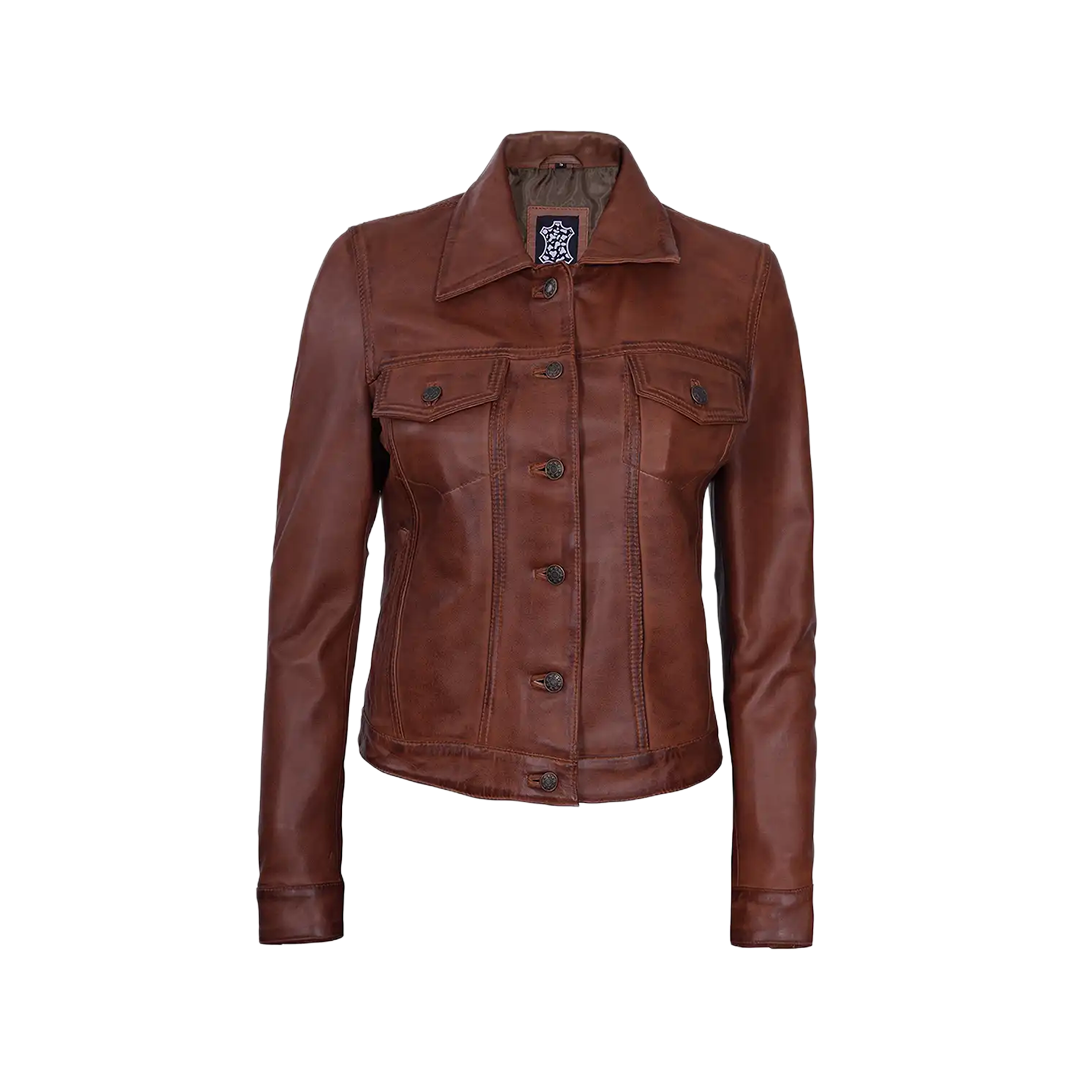 Timeless, versatile, and refined — the Fernando Women’s Cognac Brown Trucker Leather Jacket is a modern take on the classic trucker silhouette. Its tailored structure and warm cognac finish offer a fresh yet familiar look that complements any wardrobe.