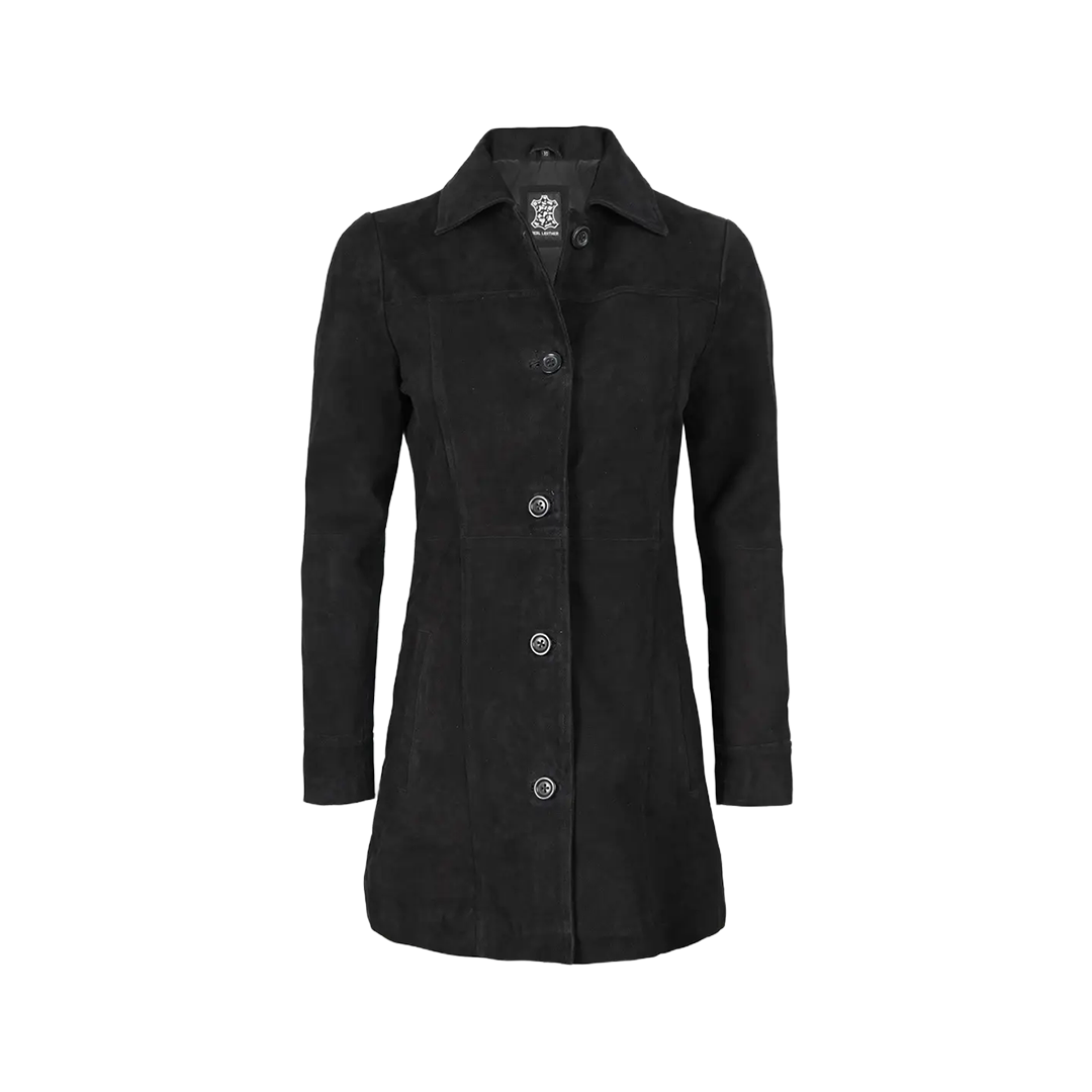 Introducing the perfect outerwear staple—Kandis Women's Black Suede Car Coat, designed for those who value both luxury and functionality. With its refined 3/4 length silhouette and soft suede finish, this coat brings timeless elegance to modern wardrobes.
