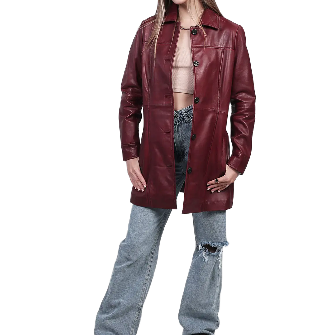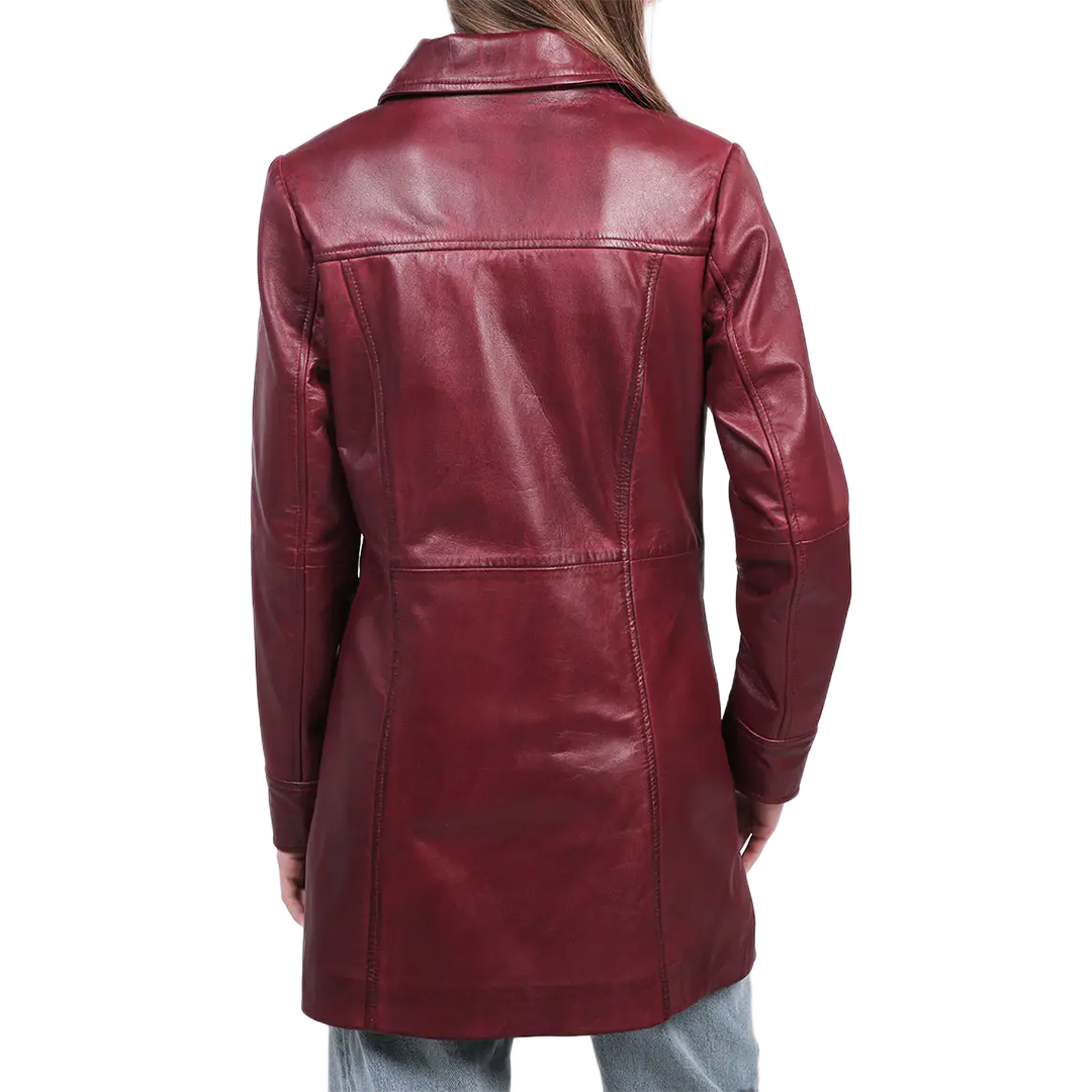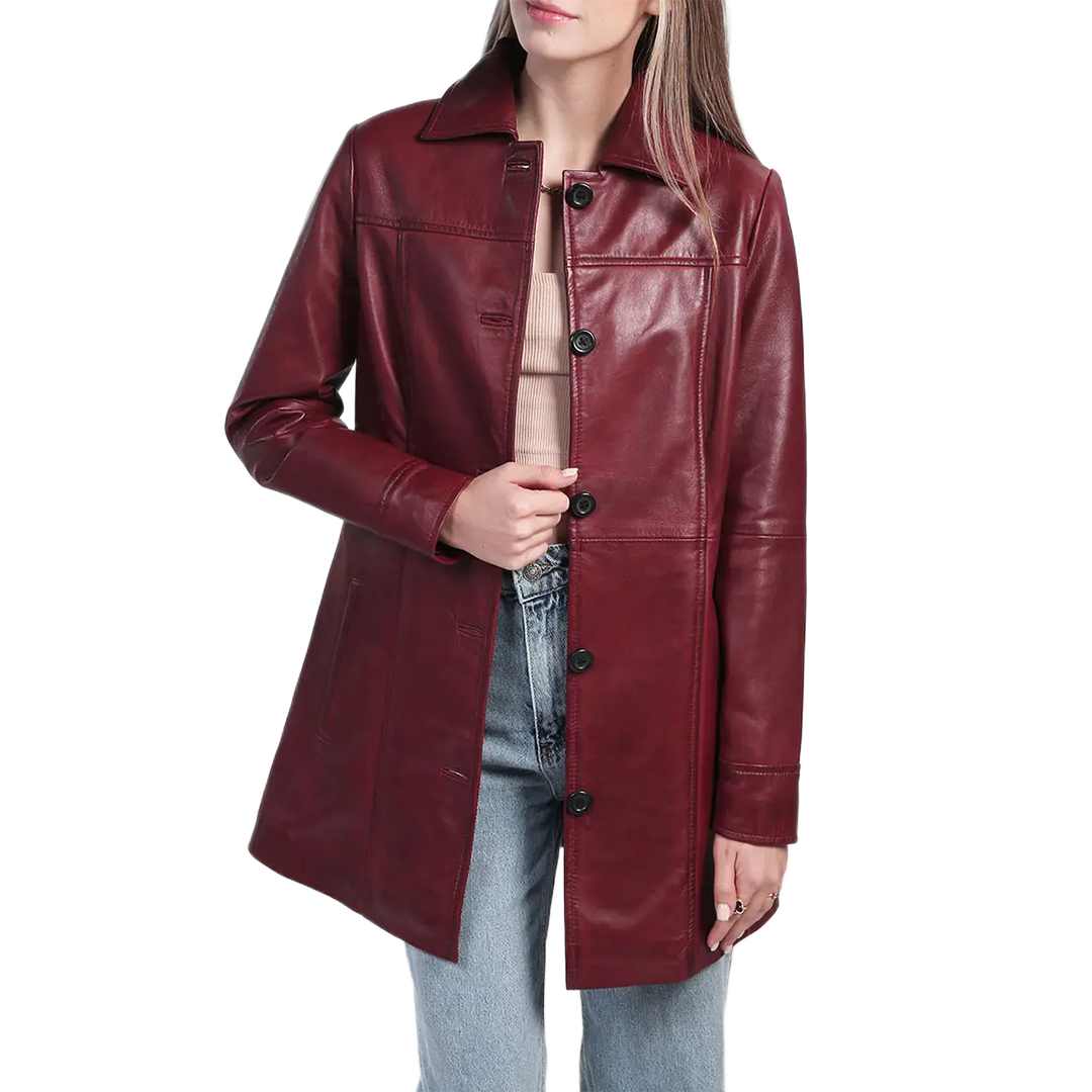Make a statement in rich color and timeless design with the Kandis Women's Burgundy Leather Car Coat. Crafted from 100% real lambskin leather, this 3/4 length coat offers both refined warmth and day-to-night sophistication.