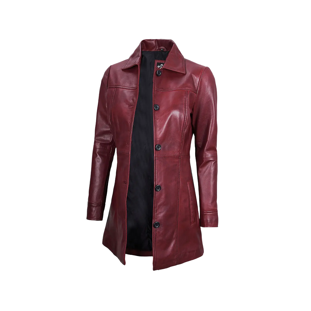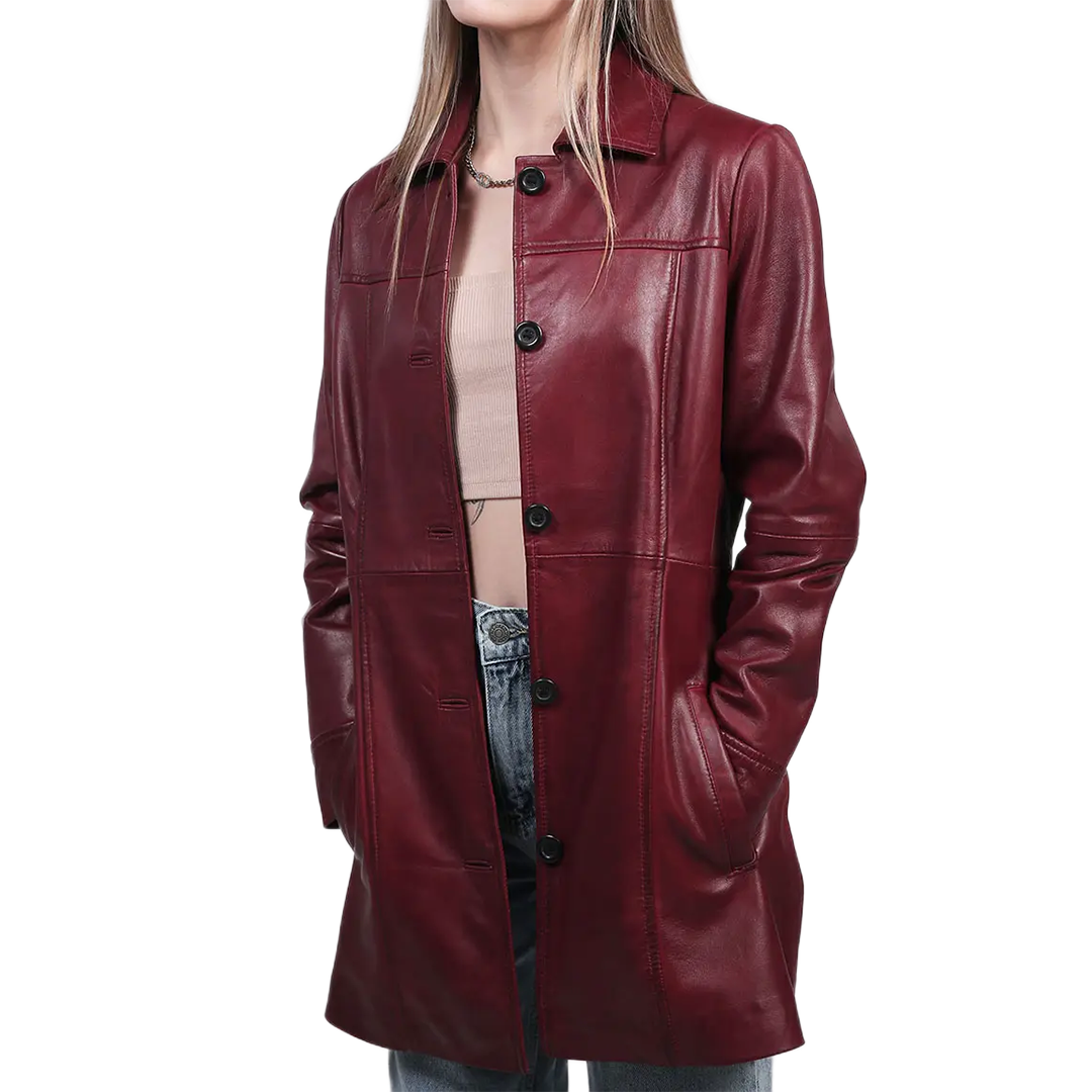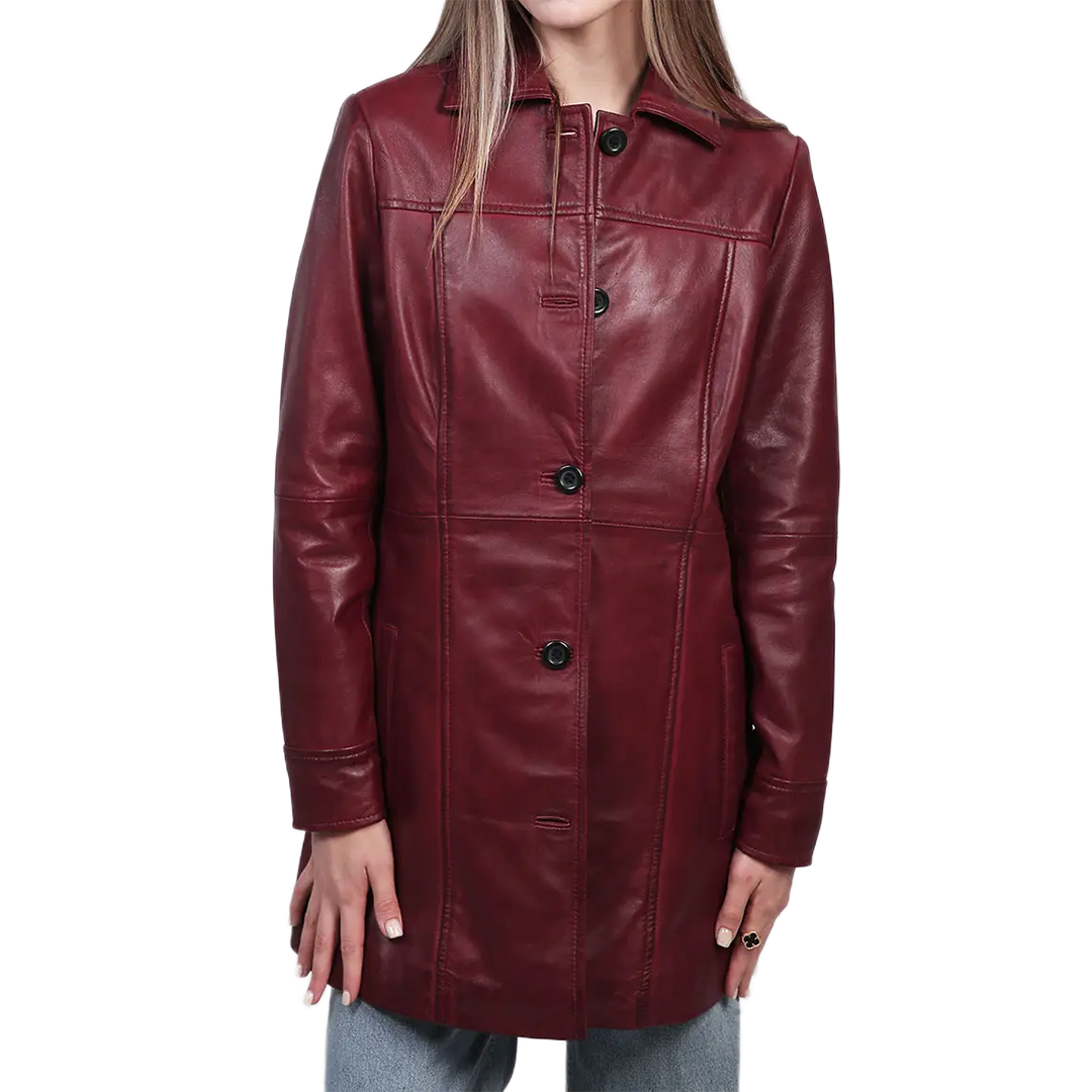 Make a statement in rich color and timeless design with the Kandis Women's Burgundy Leather Car Coat. Crafted from 100% real lambskin leather, this 3/4 length coat offers both refined warmth and day-to-night sophistication.