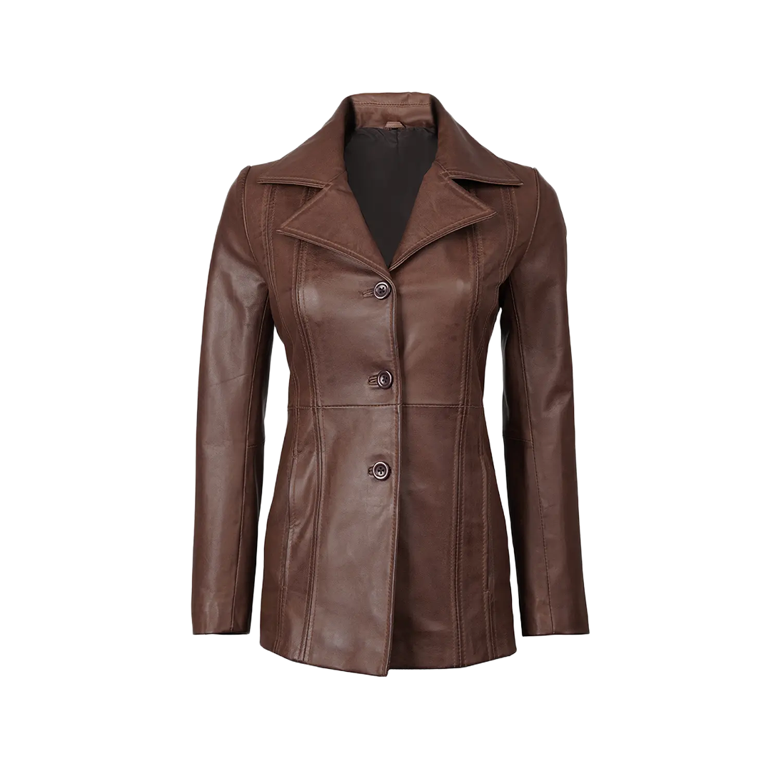 The rich dark brown color offers a classic, versatile look that works for both professional settings and casual outings. Designed in a 3/4 length cut, it provides ample coverage while maintaining a flattering silhouette. The three-button front closure and clean structure give it a polished finish.