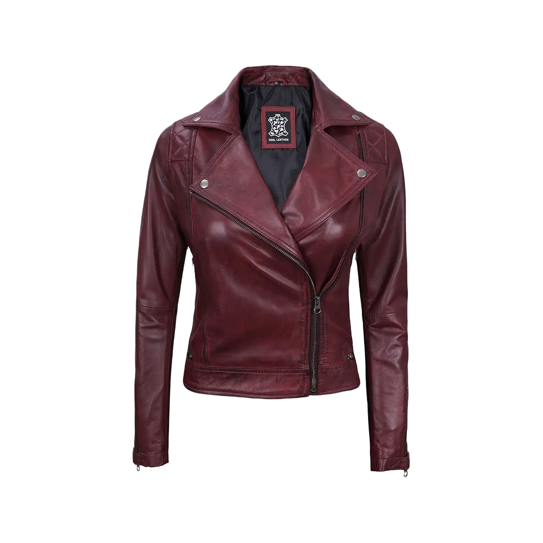 Unleash your inner rebel with refined sophistication in the Kimberley Motorcycle Leather Jacket — a rich burgundy essential made to turn heads and command attention wherever you go.