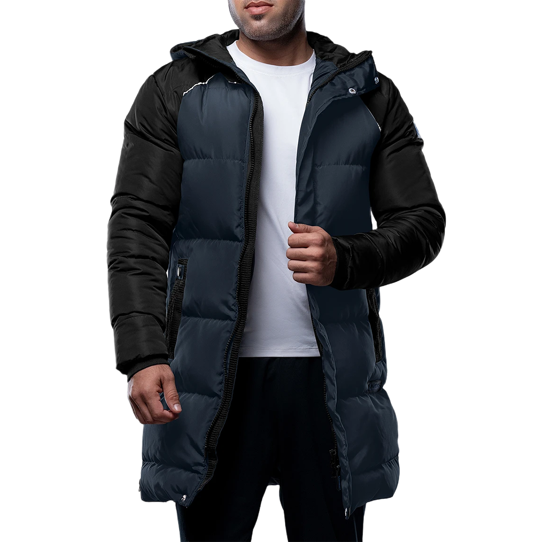 Elevate your winter wardrobe with this striking two-tone parka, expertly engineered for temperatures down to 14°F (-10°C). The bold blue and black color-block design merges urban edge with technical performance, featuring eco-conscious insulation and full-coverage protection for the modern man on the move.