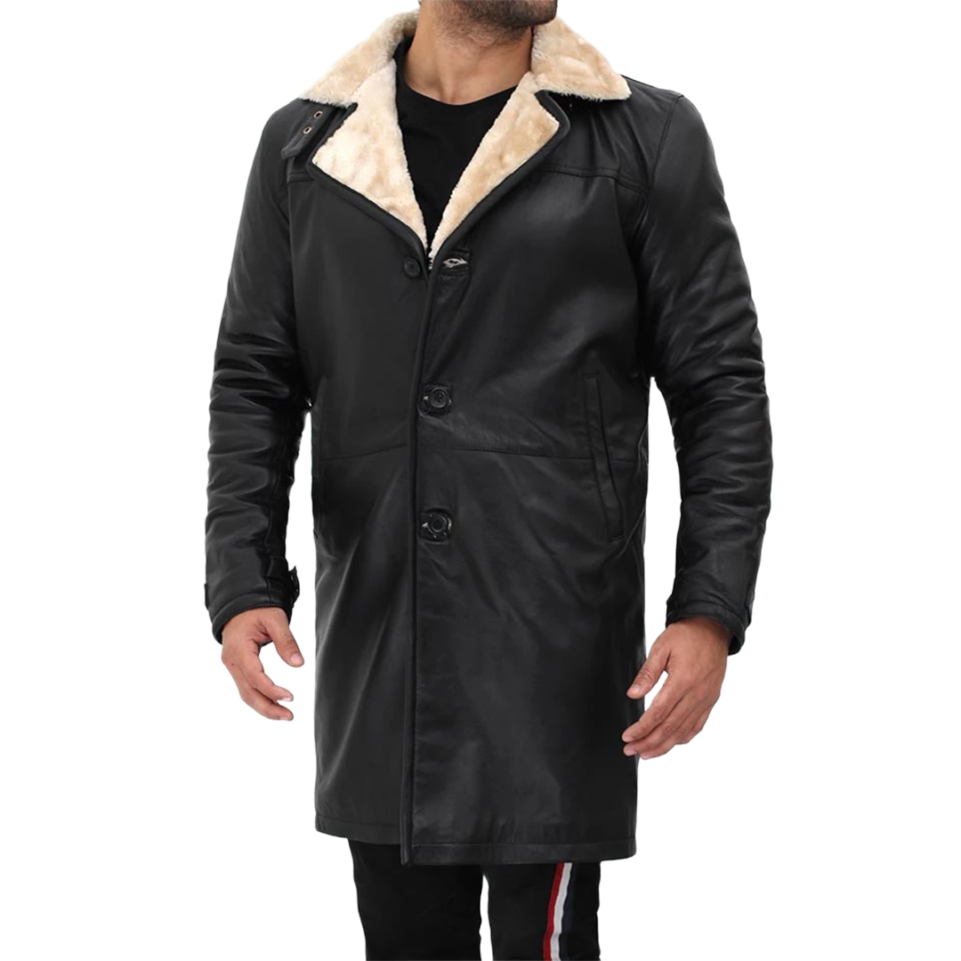 Command attention with this striking shearling coat, featuring premium black leather exterior and plush beige faux shearling lining. Designed for the modern gentleman who values both style and substance, this coat delivers exceptional warmth without compromising on refined aesthetics.