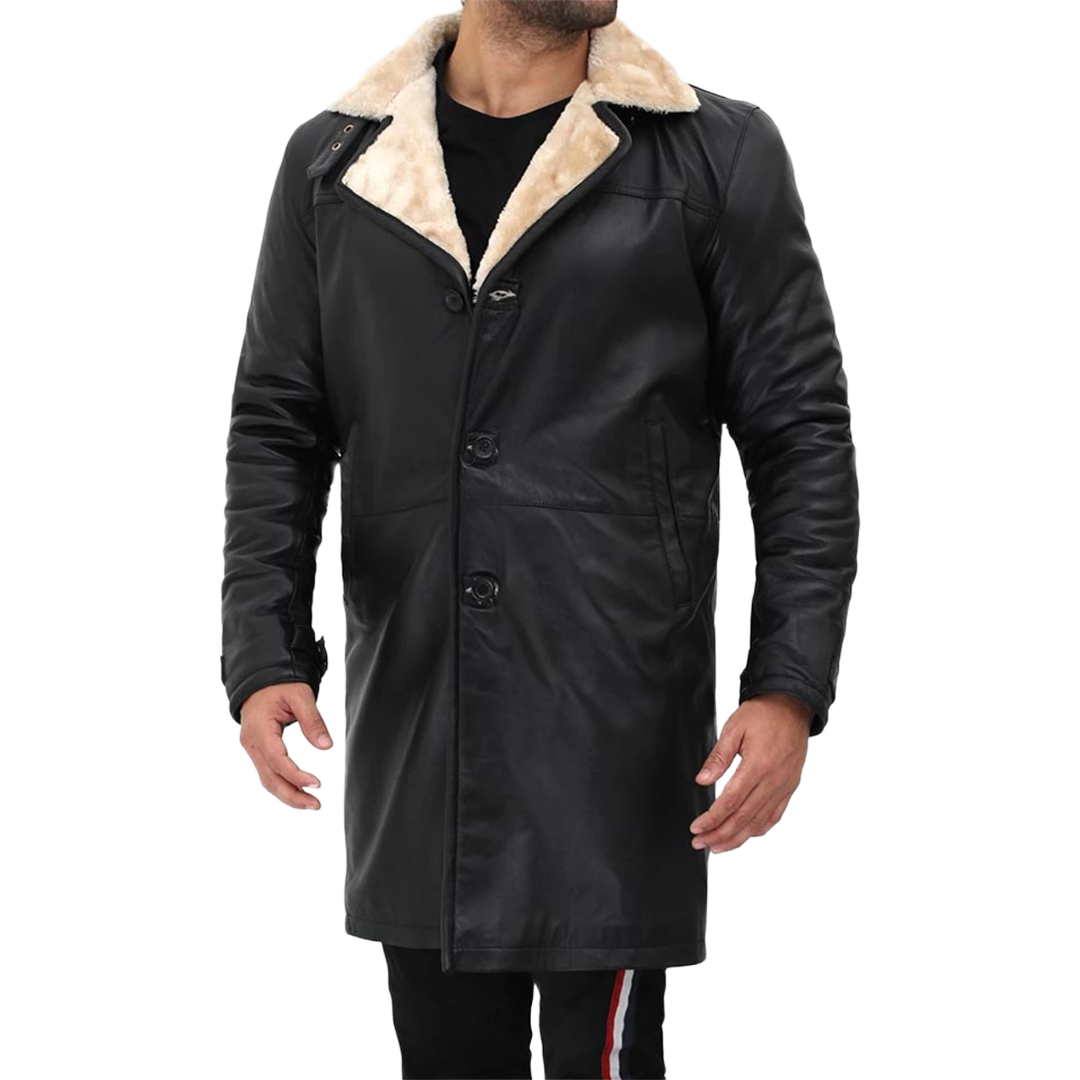 Stay warm in style with this luxurious leather coat. Crafted from premium black leather with beige faux shearling lining, this coat combines timeless elegance with modern functionality for cold weather protection.