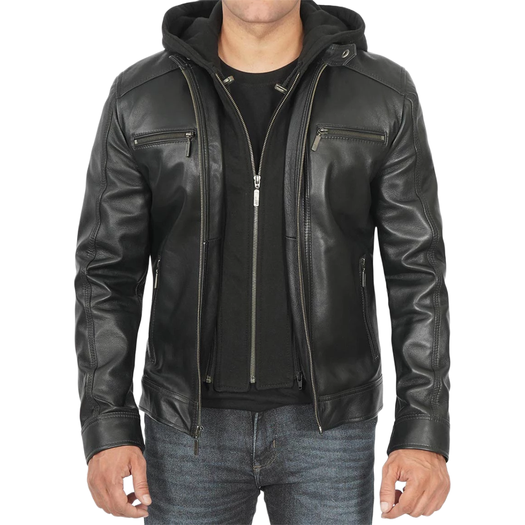 Crafted from 100% genuine lambskin leather, this black racer jacket seamlessly blends classic cafe racer aesthetics with contemporary functionality through its removable hoodie. The sleek silhouette transitions effortlessly from urban streets to evening engagements.
