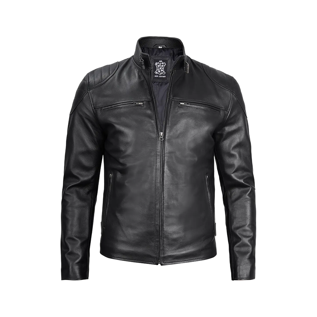 Crafted from 100% genuine lambskin leather, this sleek black cafe racer jacket combines timeless motorcycle heritage with contemporary details. The structured shoulder padding and snap-tab collar deliver authentic biker aesthetics with everyday wearability.