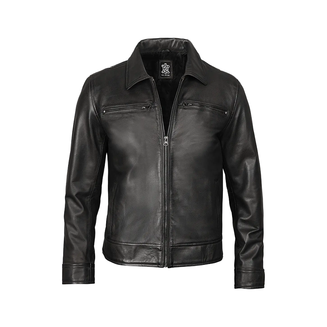 Elevate your wardrobe with this essential black leather jacket—where timeless design meets modern versatility.