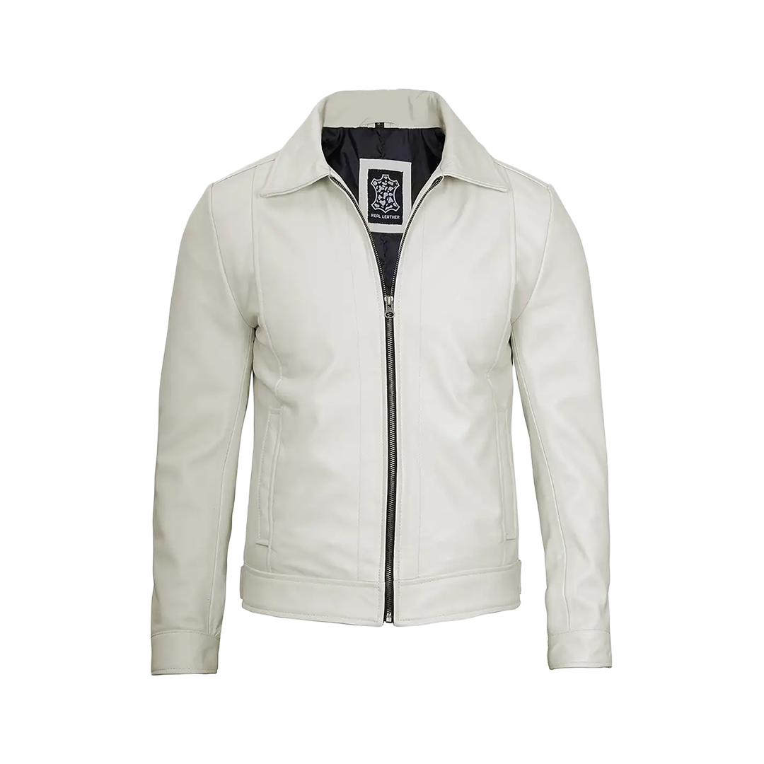 Crafted from 100% genuine lambskin leather, this off-white Harrington jacket delivers timeless sophistication with its clean lines and versatile design. The shirt-style collar and premium construction create a polished look suitable for various occasions.