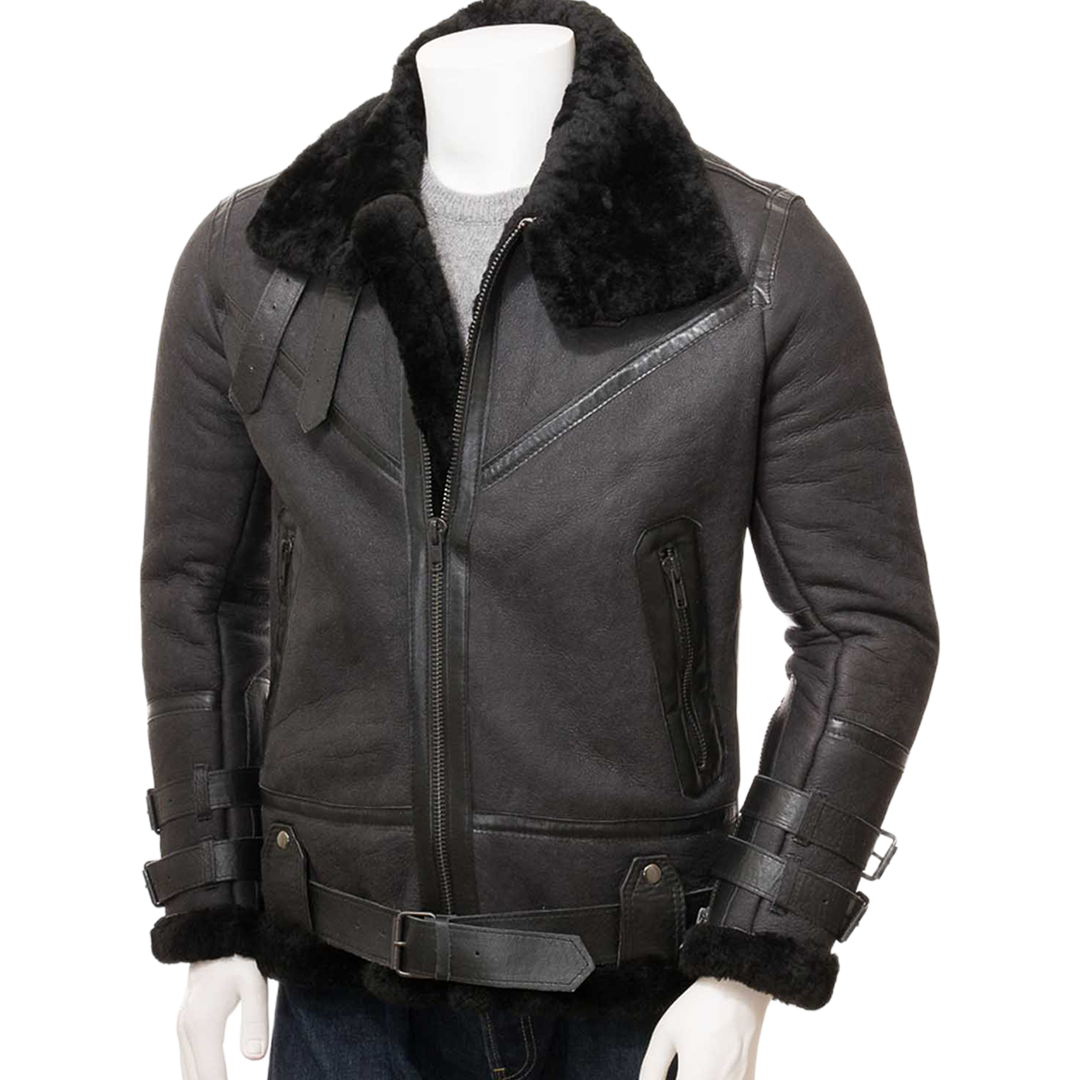 This longer-length aviator jacket in black is crafted from ultra-soft genuine shearling sheepskin, offering unmatched warmth, comfort, and bold style. Designed for those who appreciate timeless outerwear with a rugged edge.