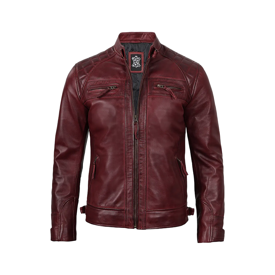 Crafted from 100% waxed lambskin leather, this burgundy jacket combines vintage biker aesthetics with modern functionality. The quilted shoulders and distressed finish create instant character, while YKK zippers and snap cuffs ensure rider-ready performance.