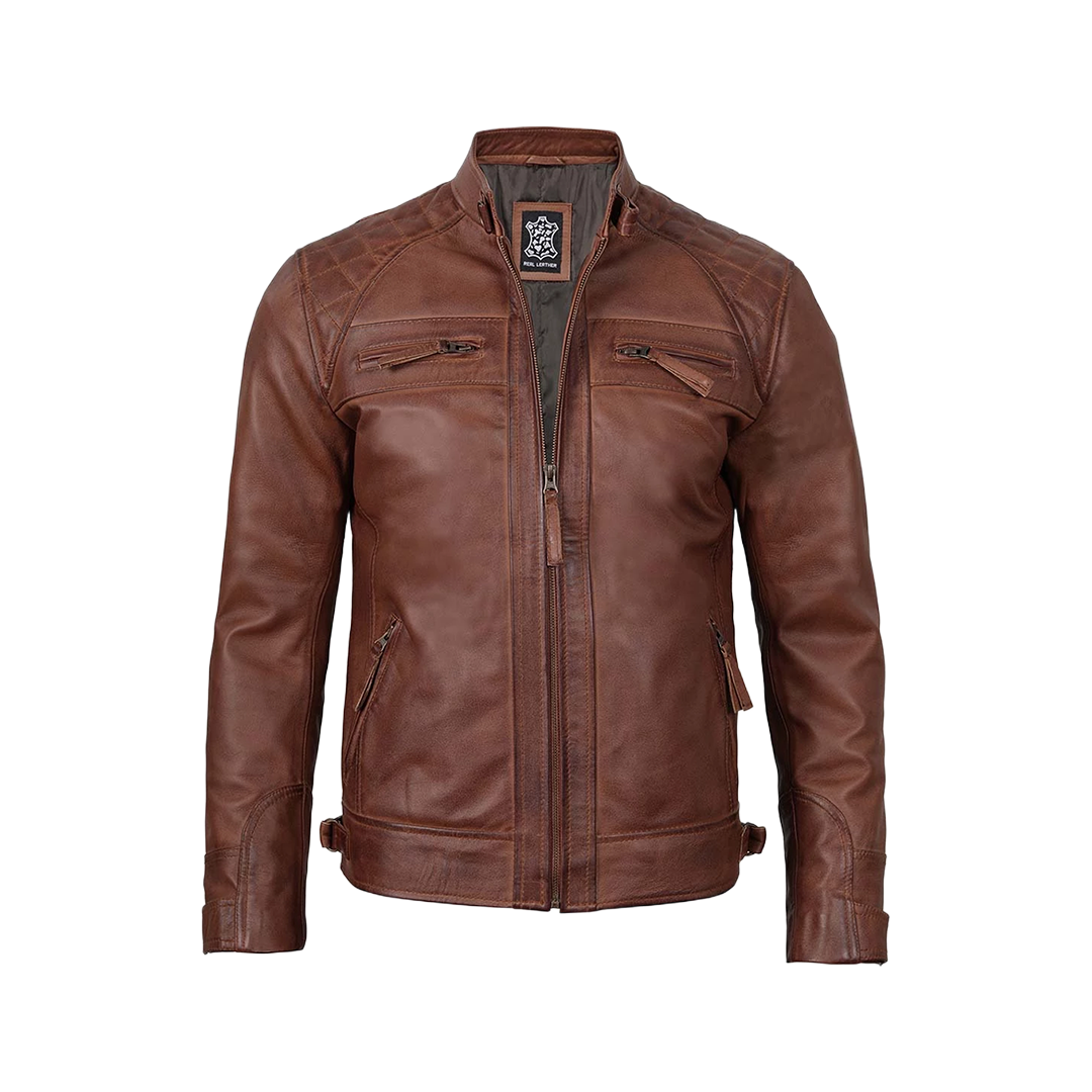 Command attention with this cognac brown motorcycle jacket, crafted from 100% genuine lambskin leather and accented with diamond-quilted shoulder panels. Designed for riders and urban adventurers alike, it blends vintage aesthetics with modern functionality—perfect for those who demand both style and substance.