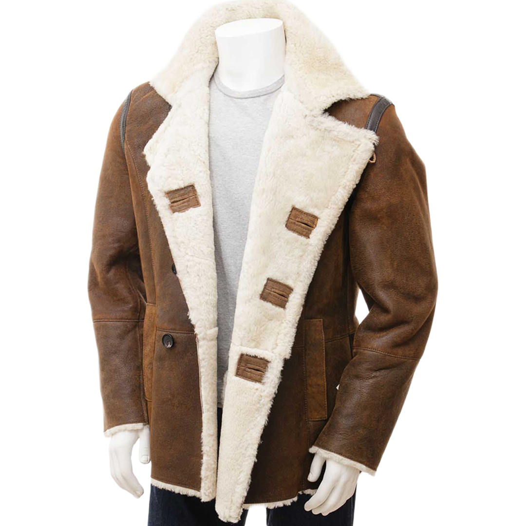 A timeless winter essential, this tan sheepskin peacoat blends classic naval design with rugged warmth and durability. Crafted for comfort in harsh weather, it’s as practical as it is refined.