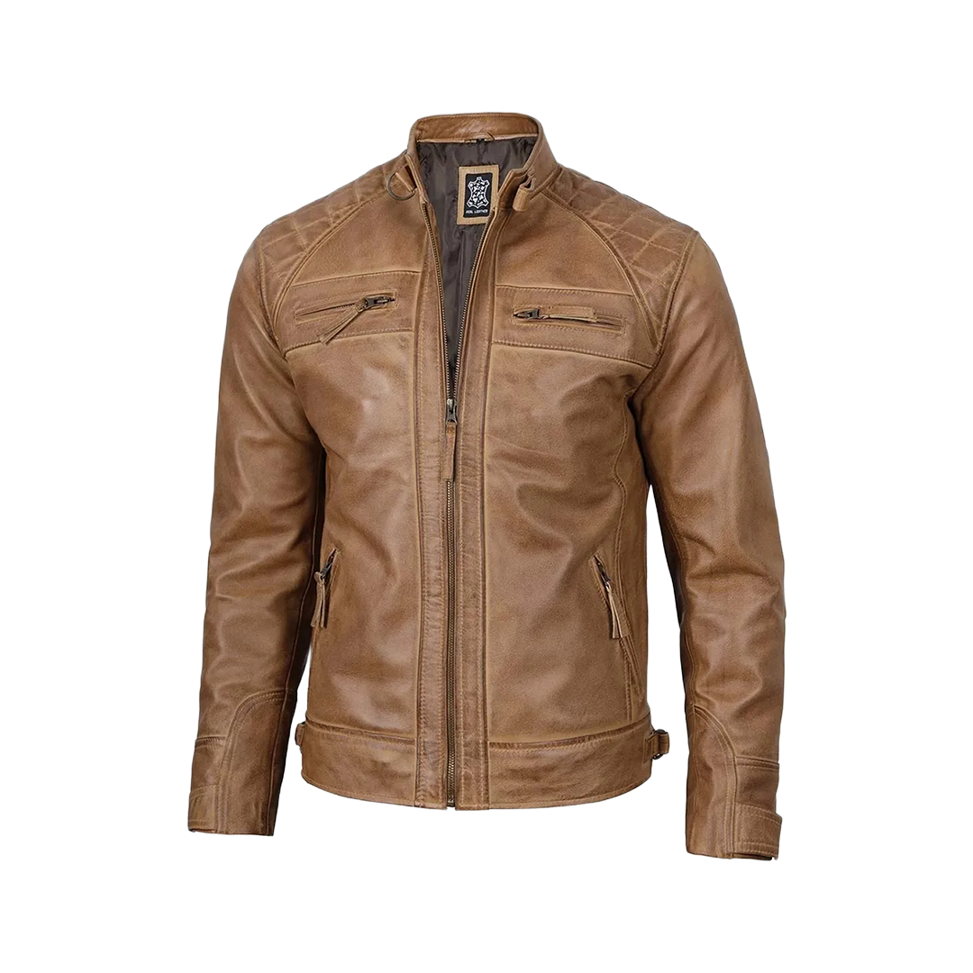 Crafted from 100% genuine lambskin leather, this waxed camel cafe racer jacket blends vintage aesthetics with contemporary performance. The quilted shoulders and adjustable waist straps offer both style and comfort.
