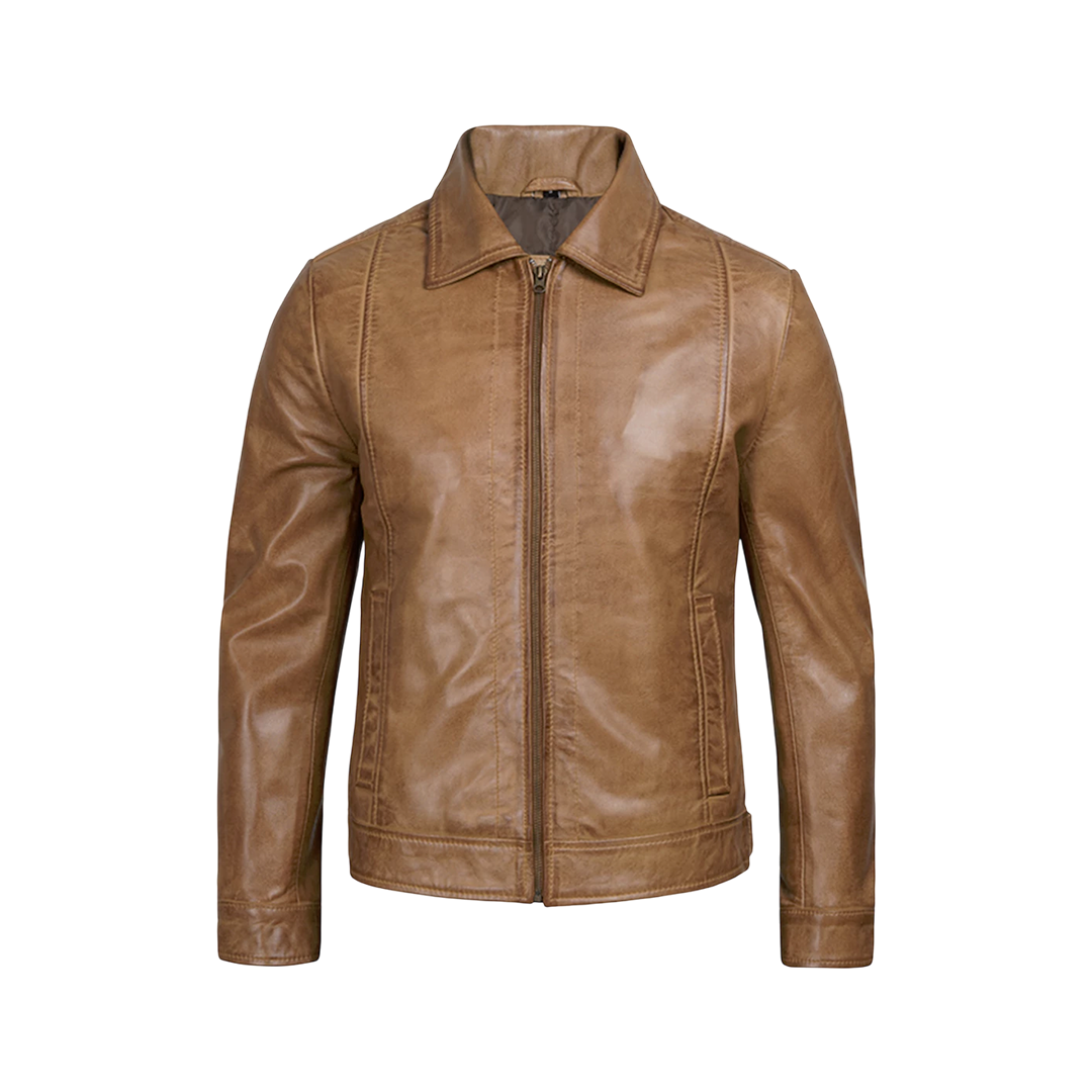 Make a statement with this vibrant yellow leather jacket, crafted from 100% genuine lambskin leather. The waxed finish and Harrington-style collar create a unique blend of retro charm and modern functionality.