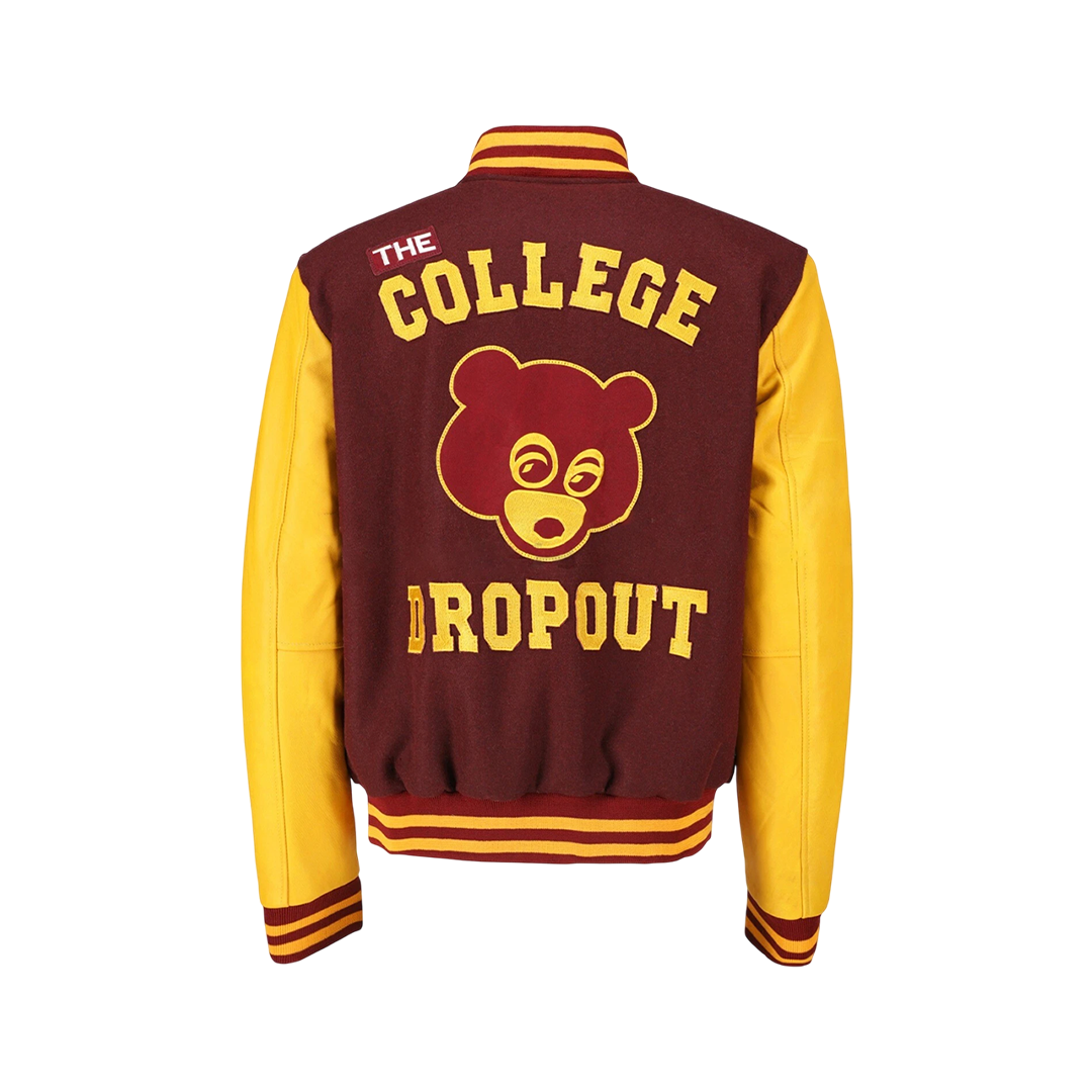Add a nostalgic twist to your wardrobe with the Men’s College Dropout Varsity Jacket, designed for those who appreciate bold color, timeless style, and street-ready confidence. With chenille embroidery and a standout maroon-and-yellow palette, this jacket is a throwback to vintage collegiate flair with a modern edge.