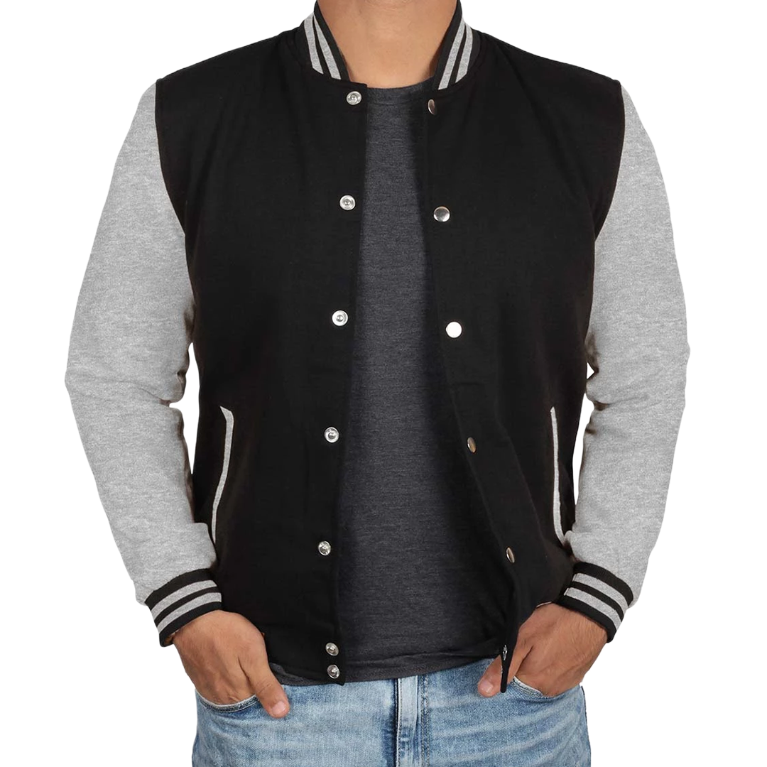 Channel retro-cool vibes with this classic varsity bomber, blending timeless collegiate style with modern comfort. The black and grey color-block design and premium fleece construction make it the perfect transitional piece for casual outings and laid-back weekends.