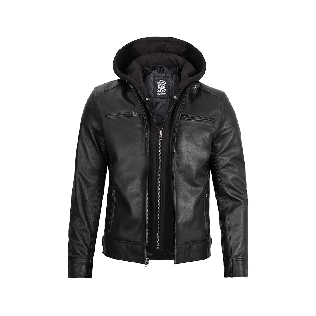 Redefine urban sophistication with this premium black lambskin jacket, seamlessly blending classic leather elegance with contemporary streetwear edge. The integrated removable hoodie offers versatile styling options for the modern man who values both form and function.