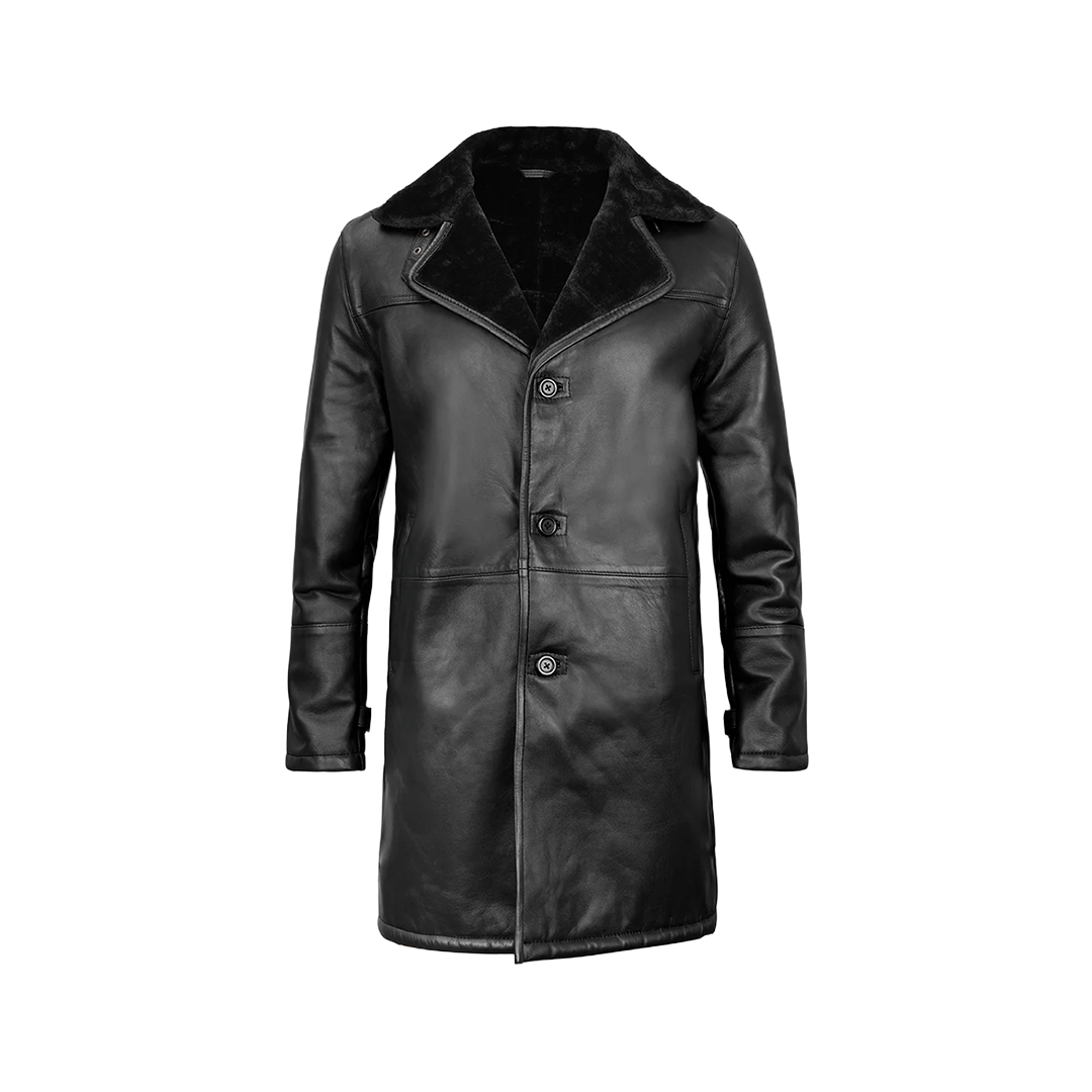 Command winter in this luxurious long leather coat. Expertly crafted from genuine lambskin leather, this sophisticated piece combines timeless elegance with plush faux shearling warmth for uncompromising cold-weather style.