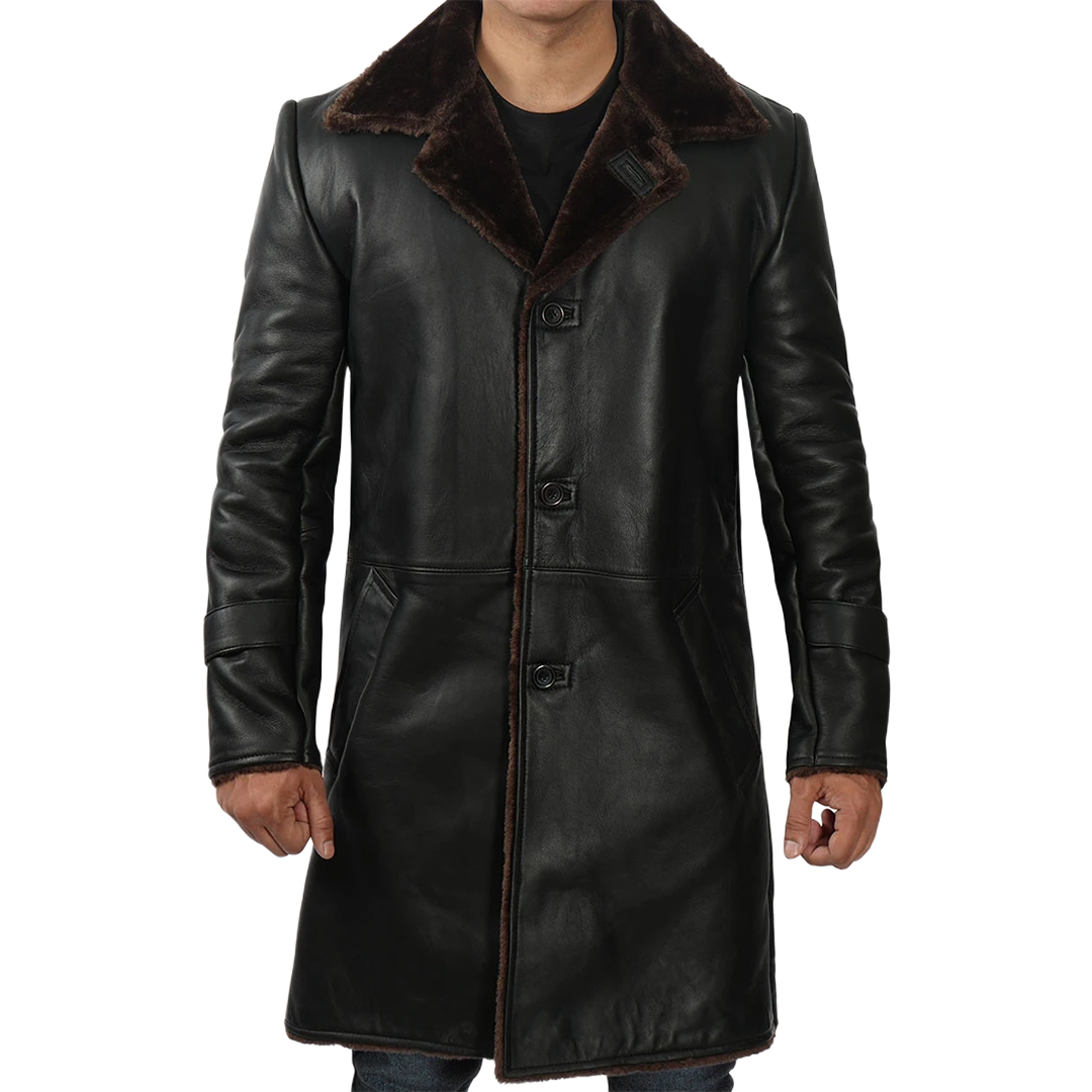 Indulge in exceptional comfort and sophistication with this premium black shearling coat, crafted from 100% genuine lambskin leather. The deep black exterior contrasts beautifully with the rich dark brown faux fur lining, creating a striking winter essential that blends elegance with rugged charm.