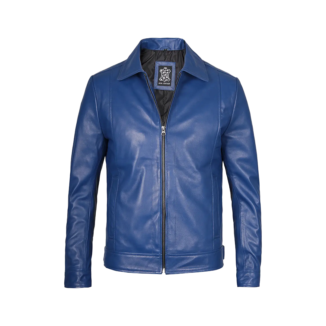 Upgrade your wardrobe with this essential blue leather Harrington jacket - a perfect blend of style and functionality.