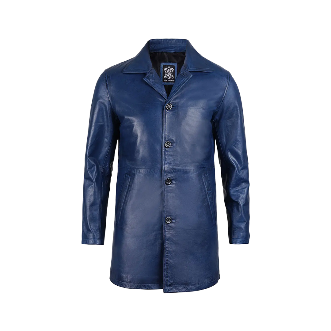 Command attention with this striking blue waxed leather car coat, crafted from 100% supple lambskin leather. The rich, saturated hue and luxurious waxed finish create a head-turning statement piece that elevates any ensemble. Designed for the confident gentleman who appreciates both style and substance.
