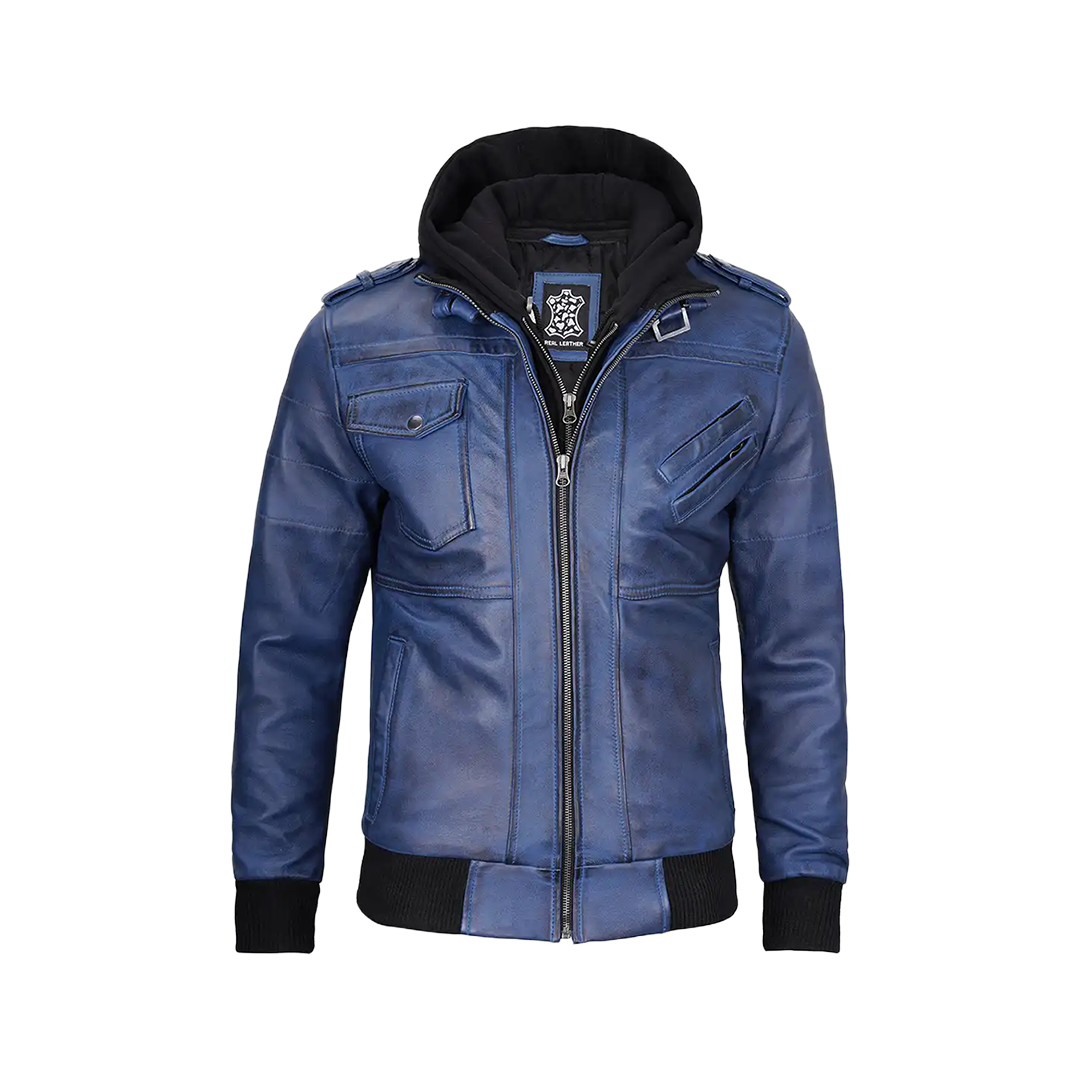Crafted from 100% genuine lambskin leather, this striking blue jacket combines contemporary design with practical features. The removable hood and waxed finish create a distinctive look that transitions effortlessly between casual and refined occasions.