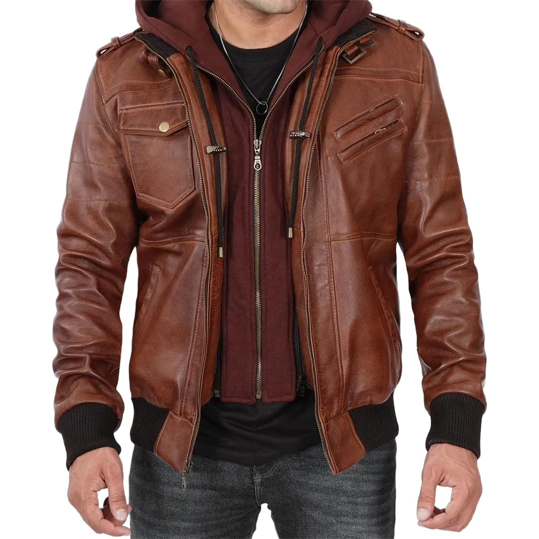 Master two looks in one with this premium brown lambskin jacket featuring a convertible hoodie design. Handcrafted for the style-conscious man, this versatile piece transitions effortlessly from rugged outdoor appeal to sleek urban sophistication.